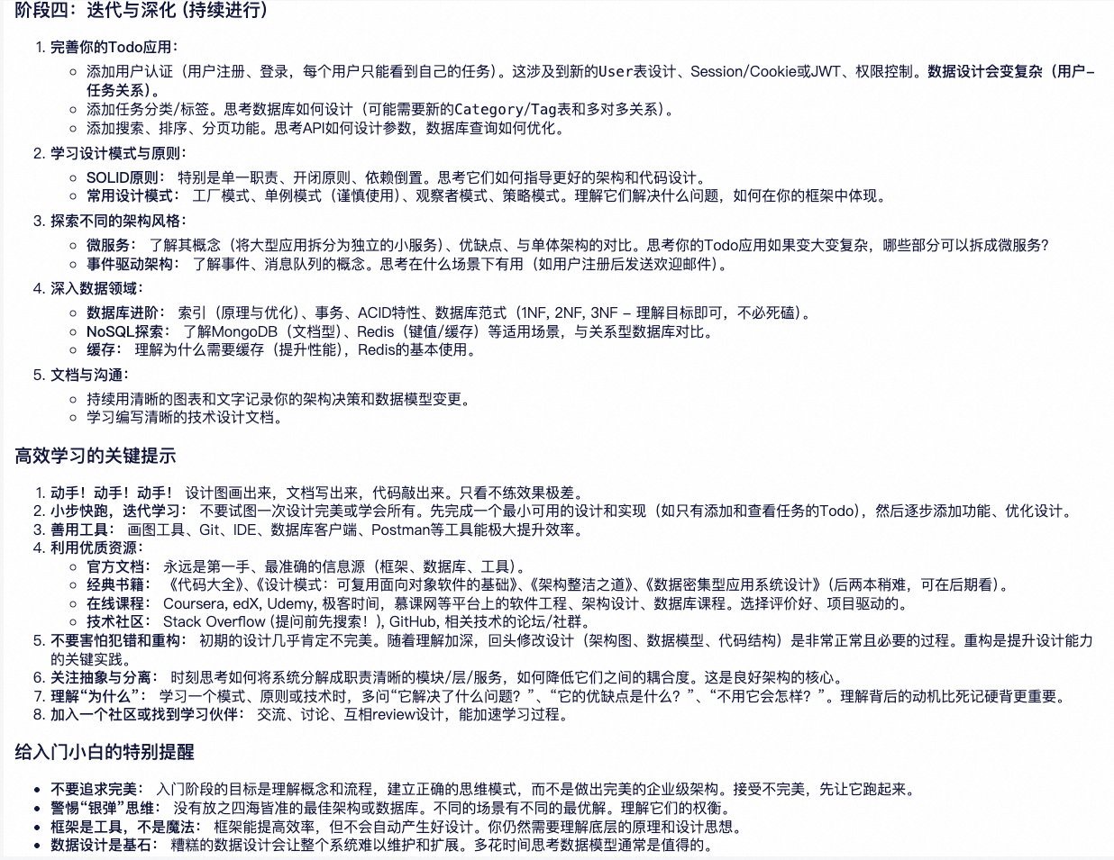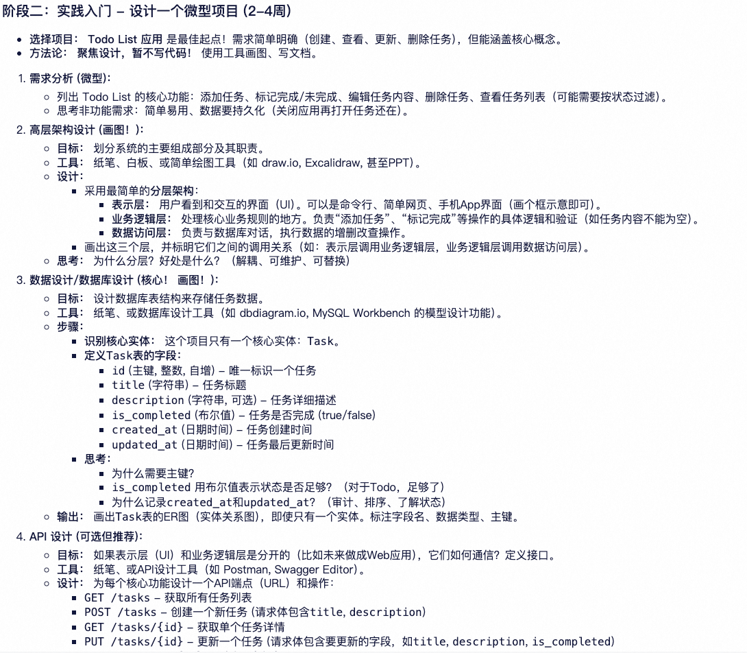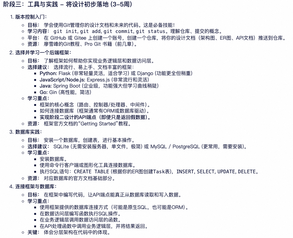 - 问题1.如果希望从头开始学软件工程,最开始想先学做一个项目的整体框架和数据设计层面,请你为一个入门小白推荐一个详细的、高效的学习路径