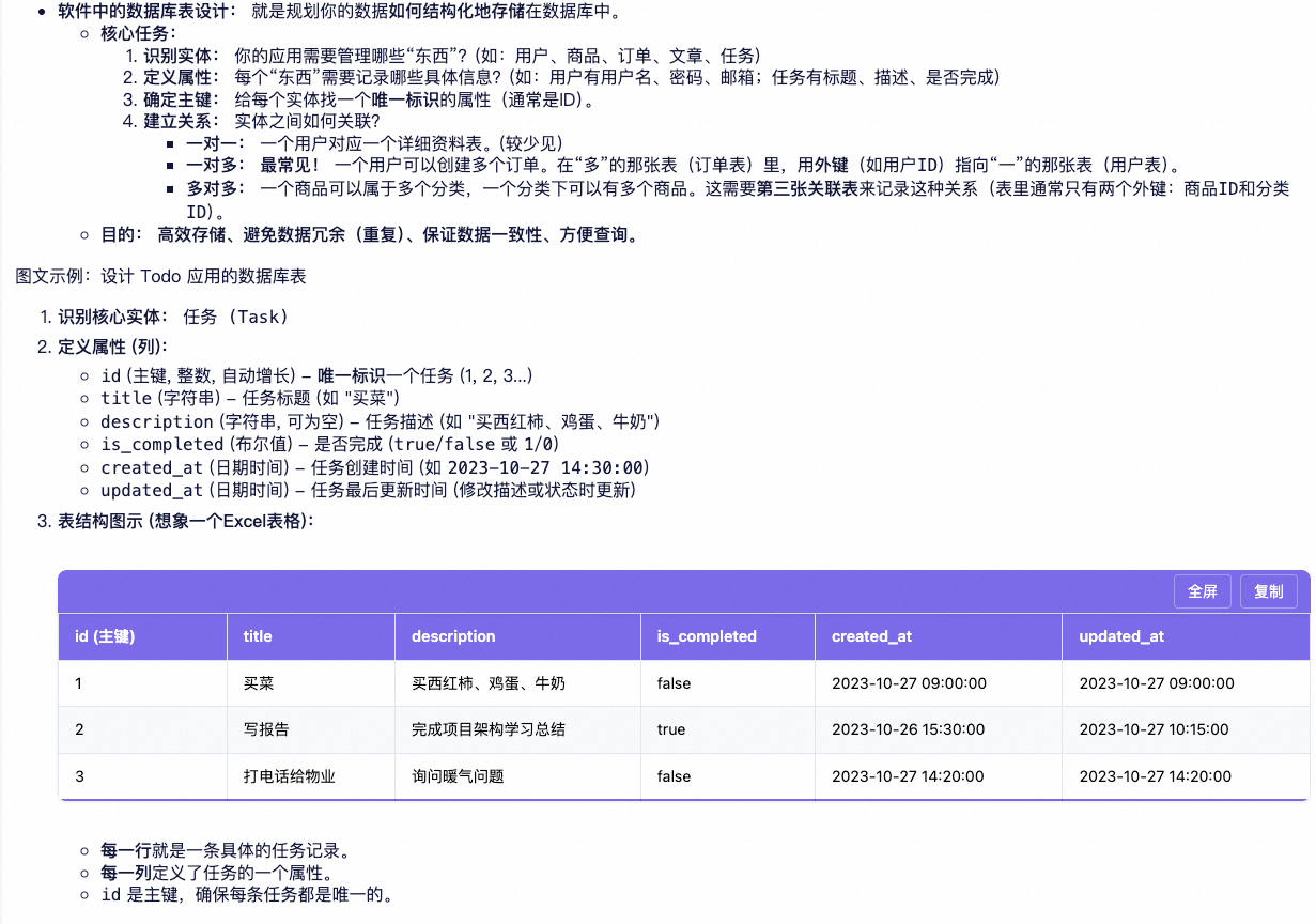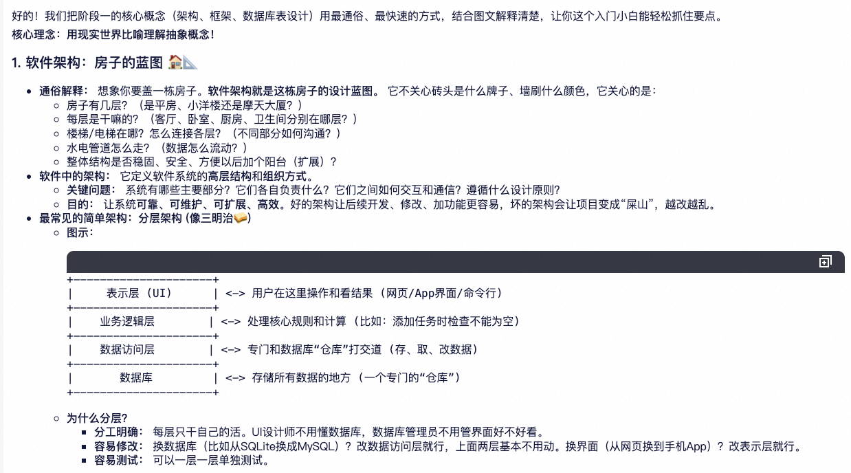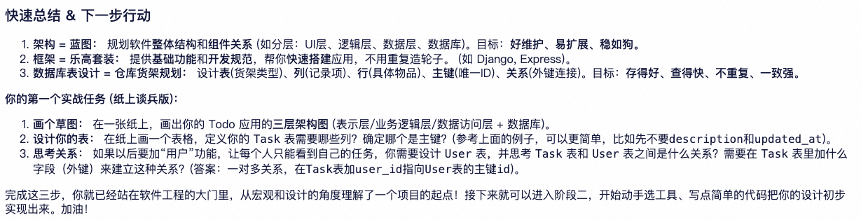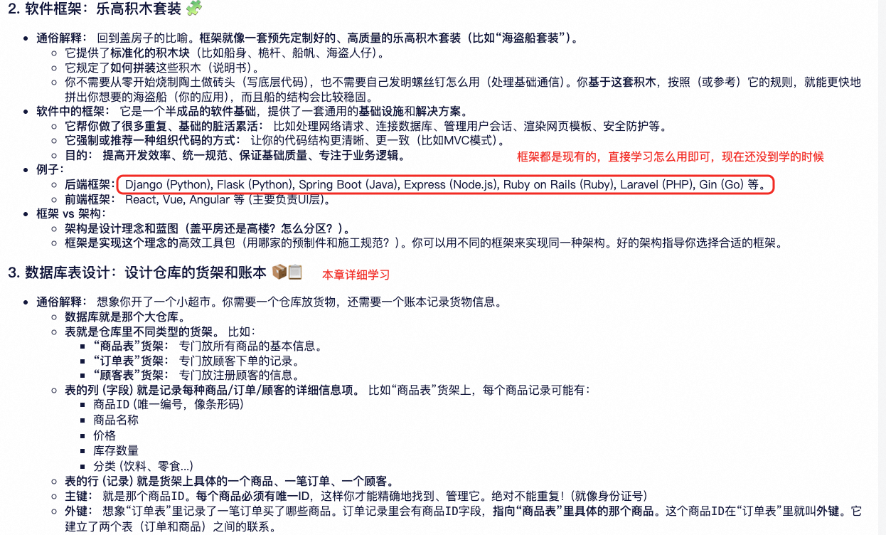 - 问题2 就针对你给的学习路径中的阶段1,如何能够快速的、简单的了解软件架构、框架和如何设计一个项目的数据库表,请你以通俗易懂的方式,结合图文介绍一下