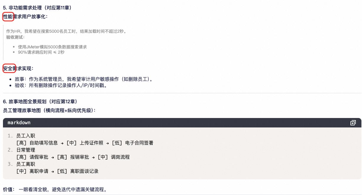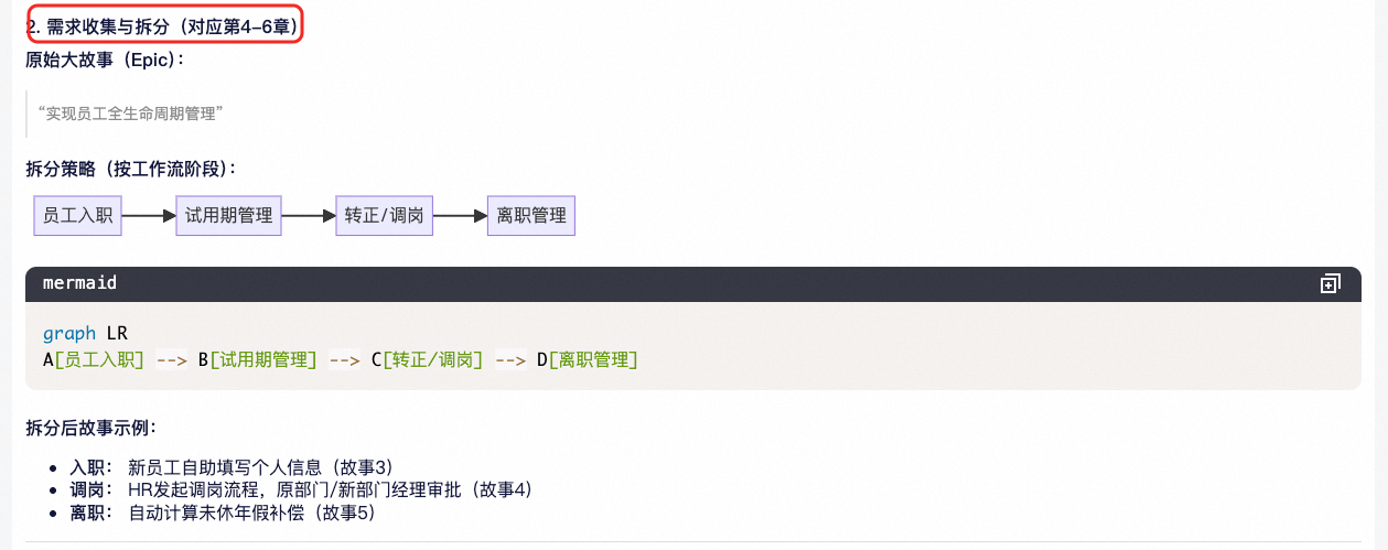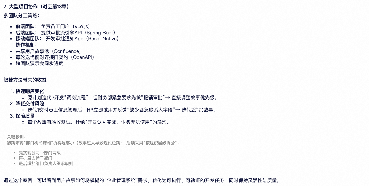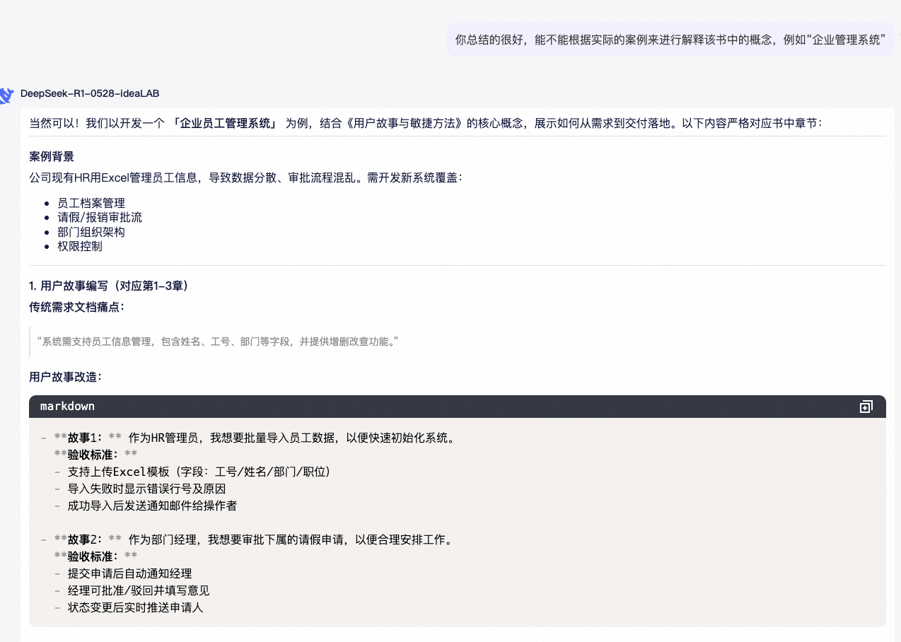 - 问题2,根据《用户故事与敏捷方法》这本书,能不能根据实际的案例来进行解释该书中的概念,例如"企业管理系统"的项目案例