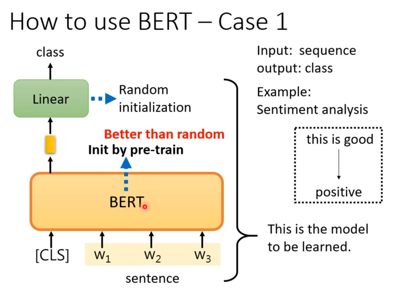 输入句子"this is good"首先被转化为词元序列,并在开头添加了特殊的[CLS]分类标识符,然后整体输入到的BERT模型中。BERT模型在这里充当了一个强大的特征提取器,其标注"Better than random Init by pre-train"强调了使用在海量数据上预训练好的参数进行初始化,远比随机初始化更能提供高质量的文本表征基础。
