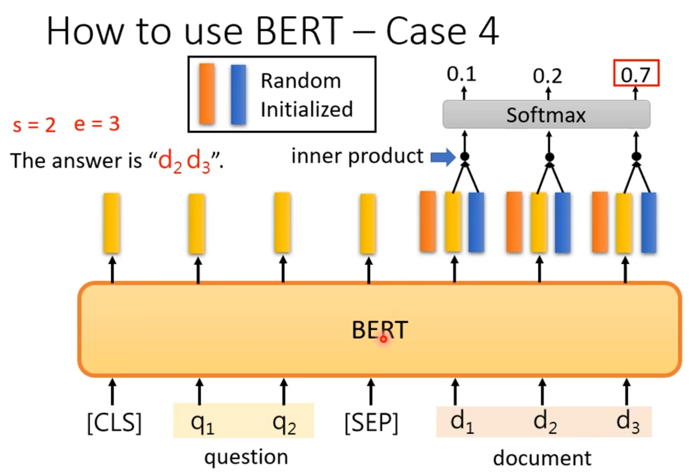 BERT模型处理整个输入序列后,会为文档中的每个词元生成一个输出向量。为了定位答案,图中引入了两个随机初始化的可训练向量。其中,向量与所有文档词元的输出向量进行内积运算,再通过Softmax层,得到每个词元作为答案起始位置(s)的概率分布。