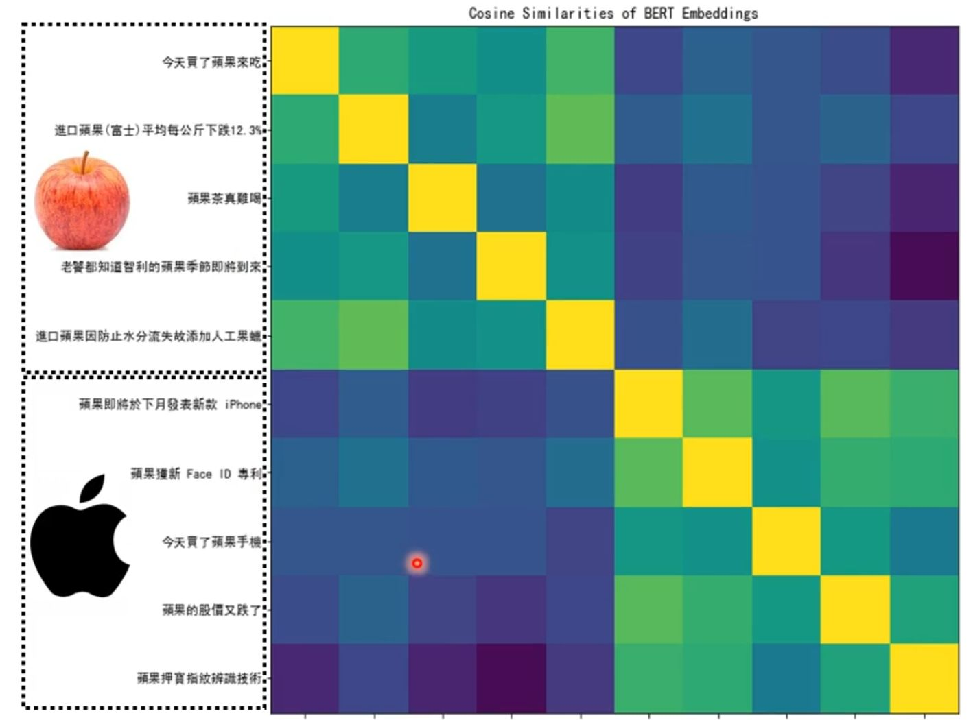 同一个汉字"果"在"喝蘋果汁"和"蘋果電腦"这两个不同的上下文语境中,经过BERT模型处理后,会生成两个不同的特征向量。计算这两个向量的余弦相似度,结果会显示出较低的相似性,这证明BERT成功地将"水果"的"果"和"苹果公司"的"果"区分开来,捕捉到了词汇的多义性。