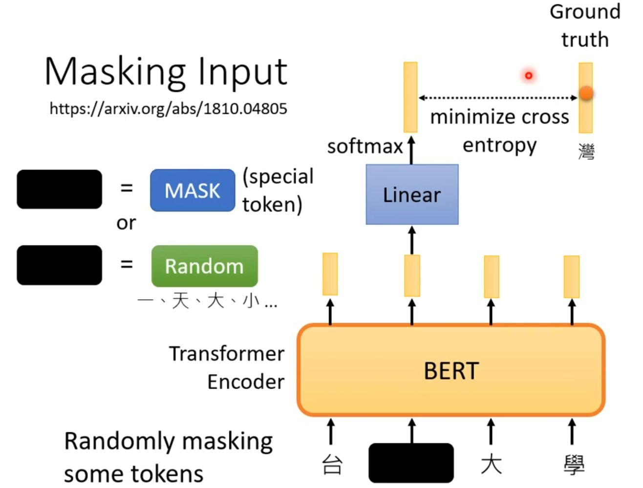 这个被部分掩盖的序列随后被送入BERT模型中进行处理。模型需要根据上下文信息来推断被掩盖位置原本应该是什么词。为了完成这个预测任务,BERT顶部的输出会先经过一个线性层(Linear),再进入一个Softmax层,从而在整个词表上产生一个概率分布,预测最可能是哪个词。最后,在流程的右侧,模型对掩盖位置的预测结果(如预测"大"、"學"等)会与真实的标签(Ground Truth,例如"灣"字)进行比较,并通过计算交叉熵损失来评估预测的误差。