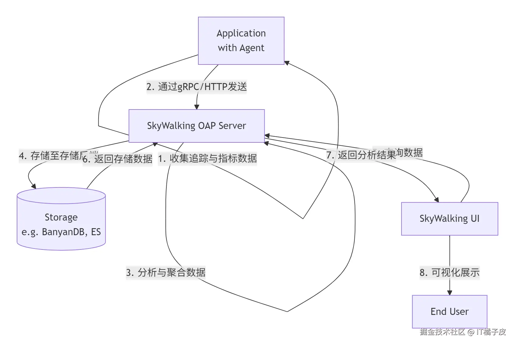 - 存储 (Storage) : 负责持久化数据。从v10.2.0开始,官方推荐使用其原生的BanyanDB,相比ElasticSearch,它在资源消耗和写入性能上有显著优化。
