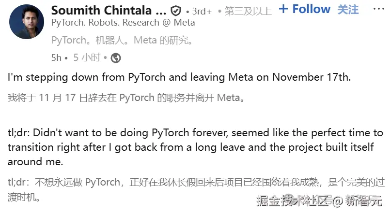 刚刚,PyTorch 创始人 Soumith Chintala 官宣,将于 11 月 17 日离职 Meta!