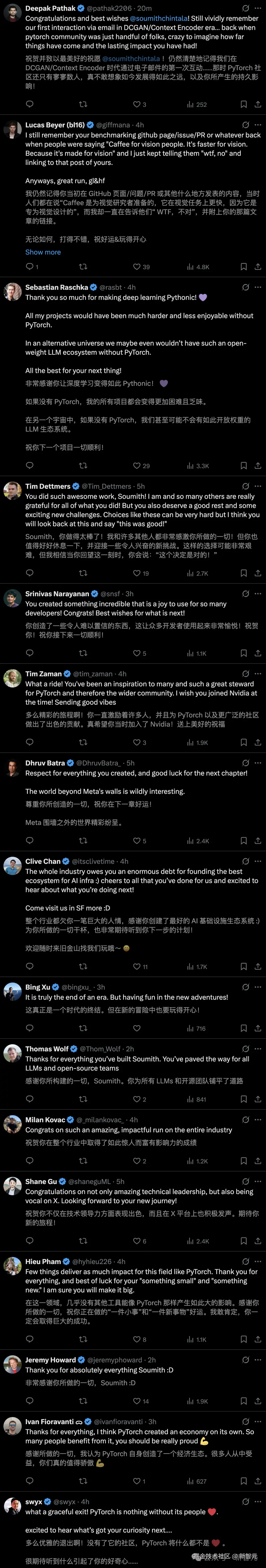 一时间,来自学界,以及 OpenAI、特斯拉、英伟达、Hugging Face 等大厂和初创的 AI 大牛们,纷纷向 Soumith 送上告别与祝福。