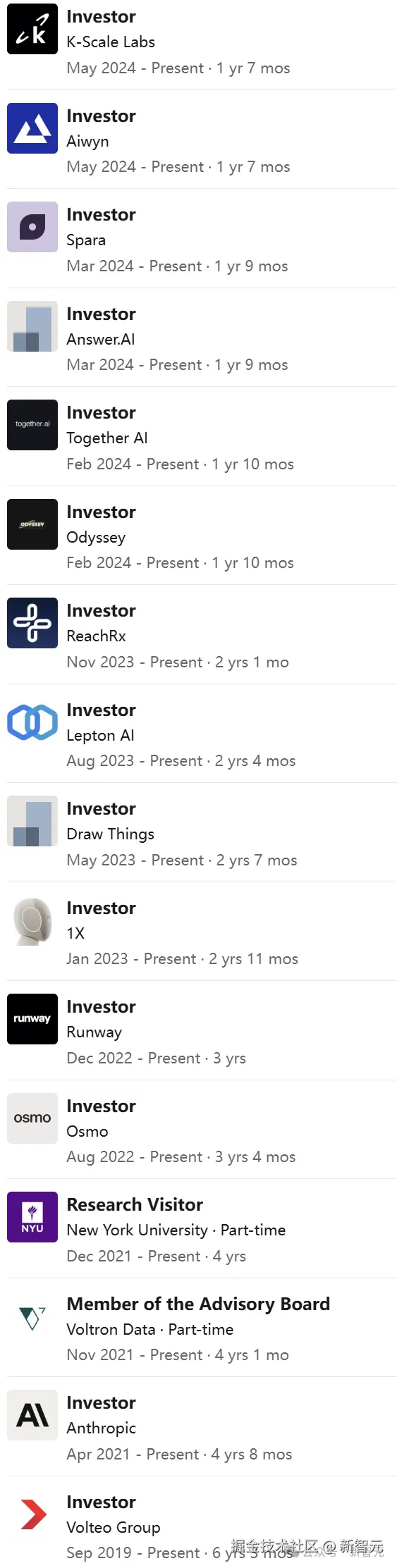 在投资领域,Soumith 的投资大多在个人的社交圈内------主要是当朋友们创业时,除此之外很少投资。投资过的公司包括 Runway、1X、Osmo、Anthropic、Together.ai、Lepton 等。