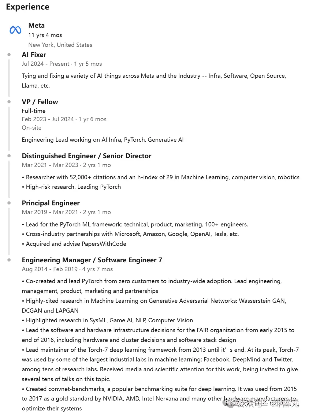 可以看到,从 2014 年入职后,Soumith 在 Meta 就像升级打怪一样,不断晋级到 VP 级别。