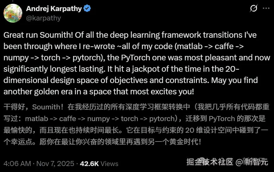 Karpathy 称,自己经历过那么多 ML 框架的折腾,每次都得几乎重写所有代码,但从 Torch 转向 PyTorch 至今,是体验最愉快、最久的。