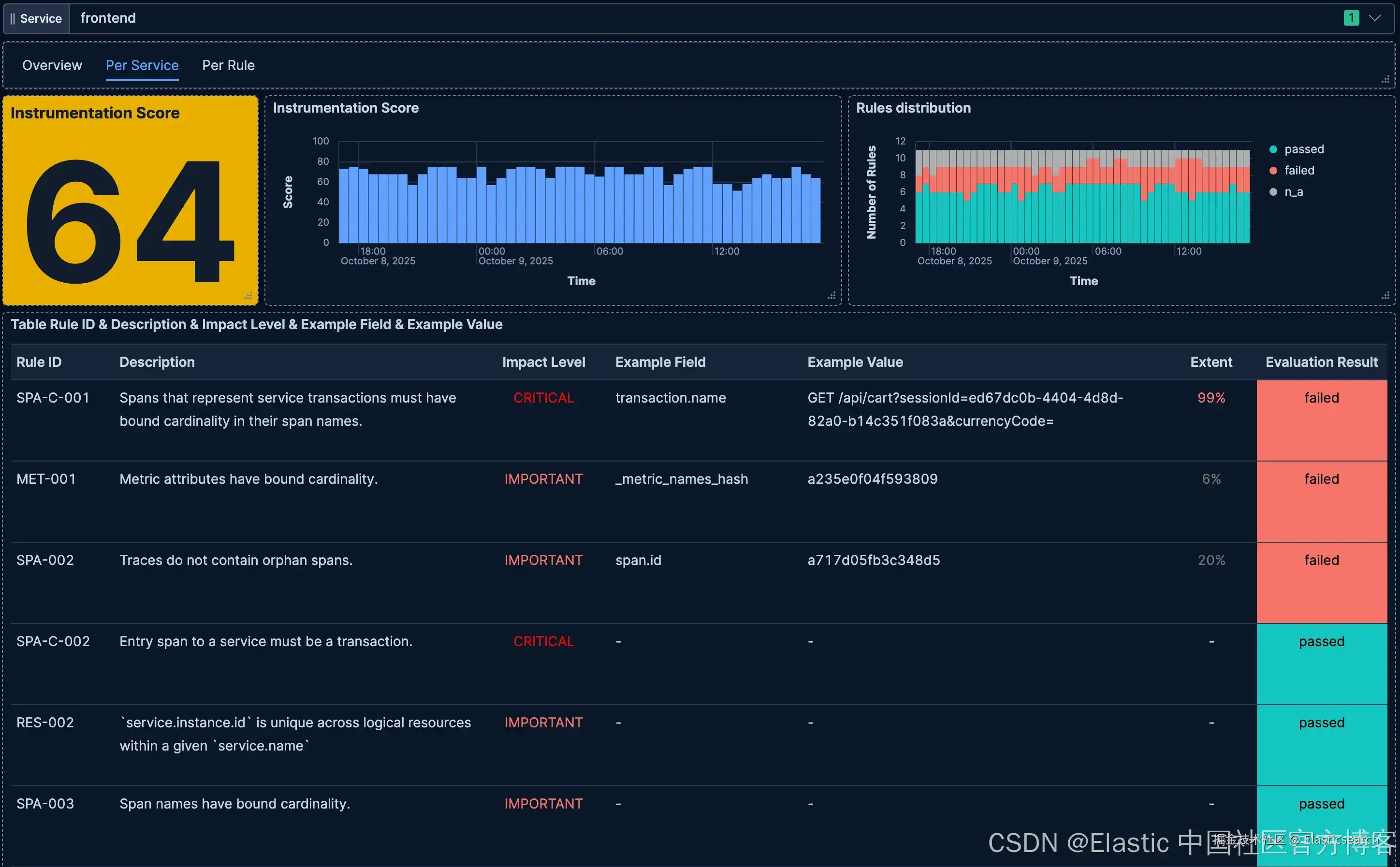 Instrumentation Score 概念允许扩展自定义规则。我在 POC 中也这样做了,用来测试一些尚未被正式定义为 Instrumentation Score 规范规则的质量规则,但这些规则对 Elastic Observability 来说很重要,可以让 OTel 数据发挥最大价值。