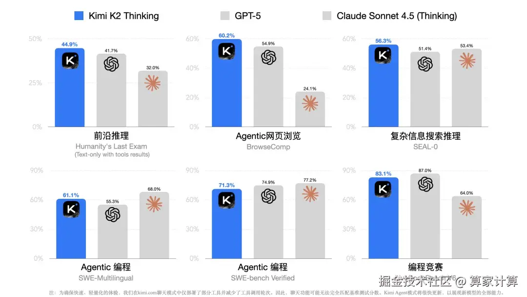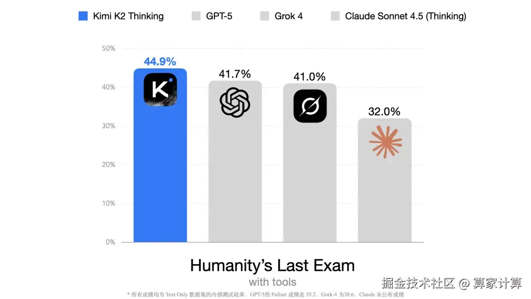 在被称为"人类最后考试"的HLE基准测试中,Kimi K2 Thinking在使用工具的条件下取得了44.9%的高分,创造了新的SOTA纪录。
