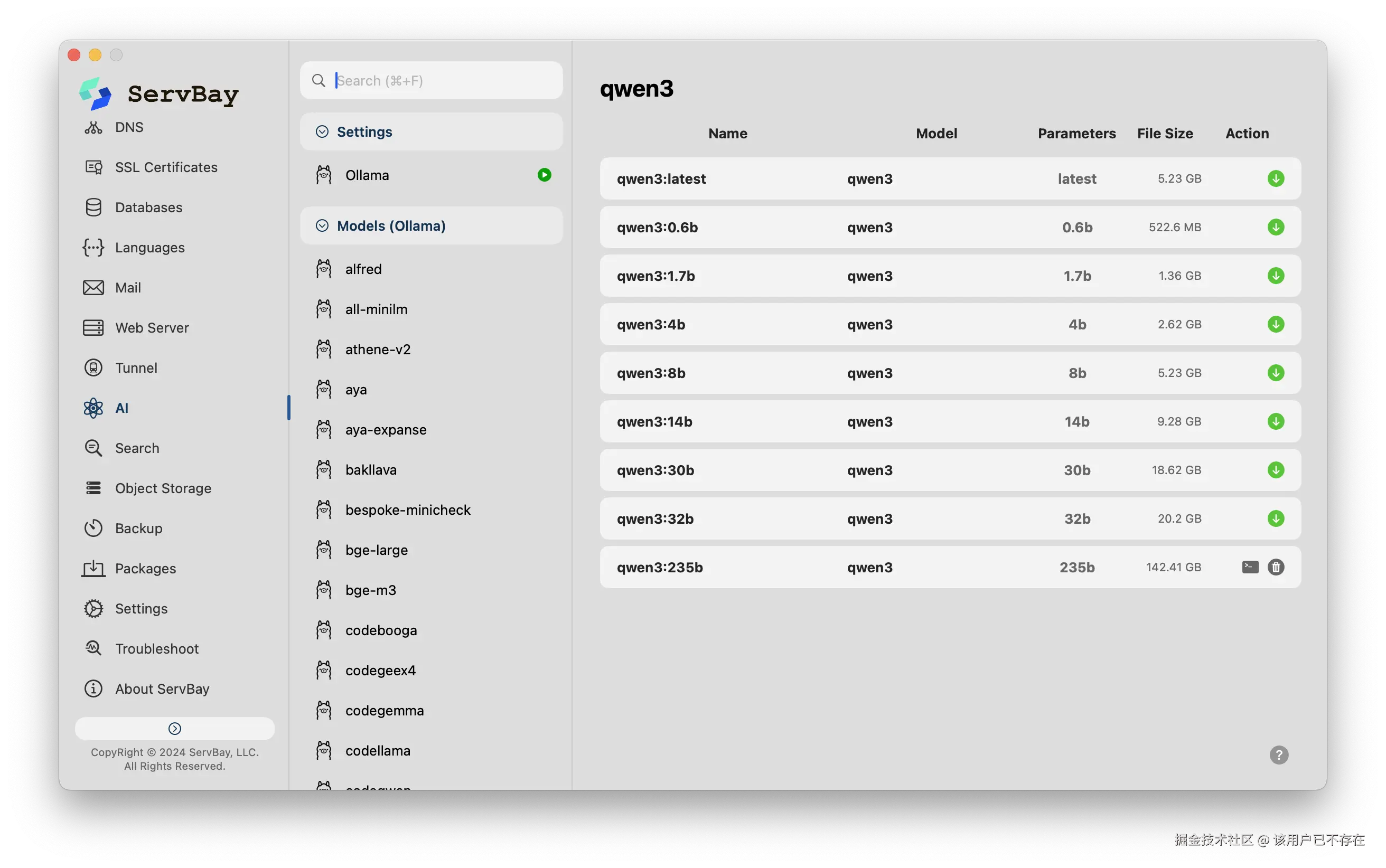 - ServBay :ServBay可是个大宝贝,它本身是一个超级强大的本地开发环境集成工具,能一键管理PHP、Node.js、Python、Rust等多种语言环境,而对于Vibe Coder 来说,它还集成了一键式本地AI部署,它把流行的模型运行框架无缝内置了进去,只需要点几下鼠标,就能在自己电脑上把Llama 3、Qwen这些顶级开源模型跑起来。下载、管理、运行等等,ServBay 都能管理。代码不出电脑,断网也能用,还没有token费用,安全感和自由度直接拉满。