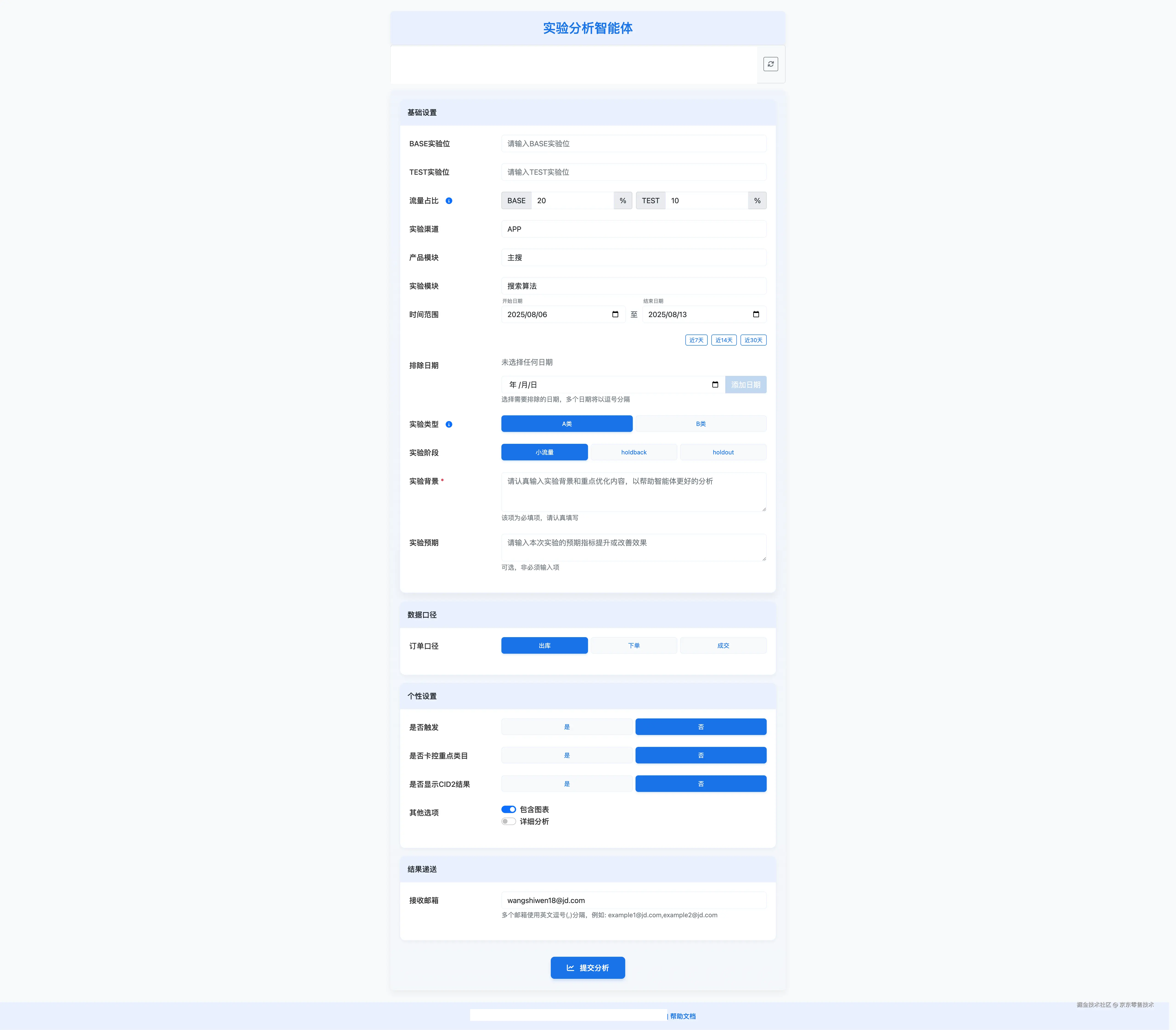同时,实验分析Agent,需要用户根据自己的实验内容,给出实验ID、实验周期、实验模块、实验背景以及实验预期等信息。而3.1节提及,部分数据耦合不同已有工具来产出,其表单是差异化的。因此,设计了一个统一表单,并在后端将关键信息透传到不同工具服务,让用户没有体感上的差异。