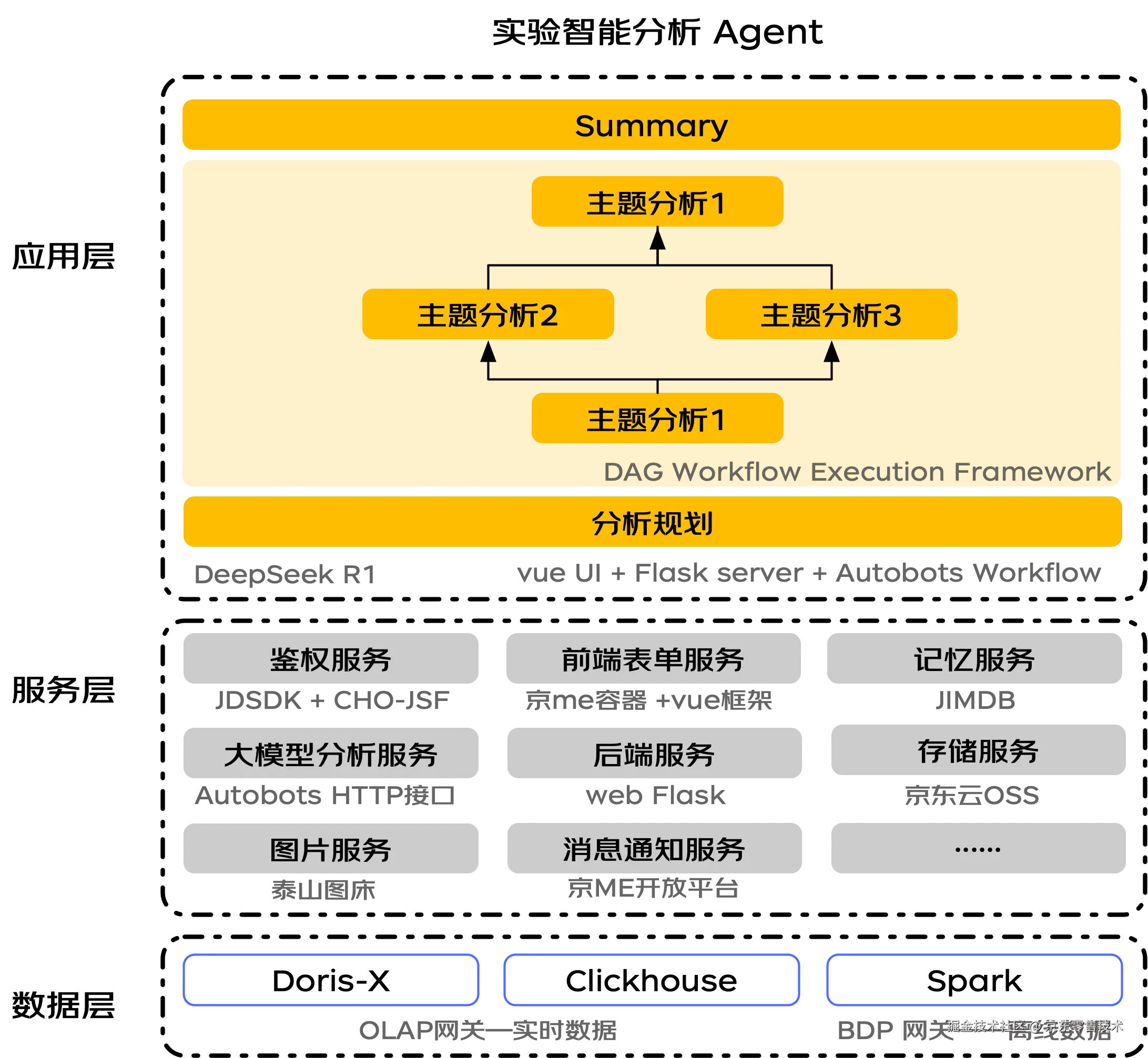 下图为Agent整体架构,采用模块化分层解耦设计,旨在实现"汇总数据---分项分析---总结呈现"的全流程智能化分析闭环。应用层作为核心业务中枢,集成了分析规划、主题分析(基于DAG Workflow Execution Framework实现任务编排)与结论汇总模块,并通过DeepSeek R1/V3模型提供分析支持,确保从宏观洞察到微观挖掘的灵活切换。服务层包含鉴权服务、前端表单服务等通用能力,选用JDSDK + CHO-JSF等公司内部成熟的技术方案,保障系统的高可用性与扩展性。数据层则依托Doris-X、Clickhouse、Spark等分布式引擎,构建OLAP网关(实时数据)与BDP网关(离线数据)双通道,既复用部门现有报告工具的指标体系,又通过独立开发的FDR分析模块实现特殊需求,在保持各工具独立性的同时完成数据统一拼接。