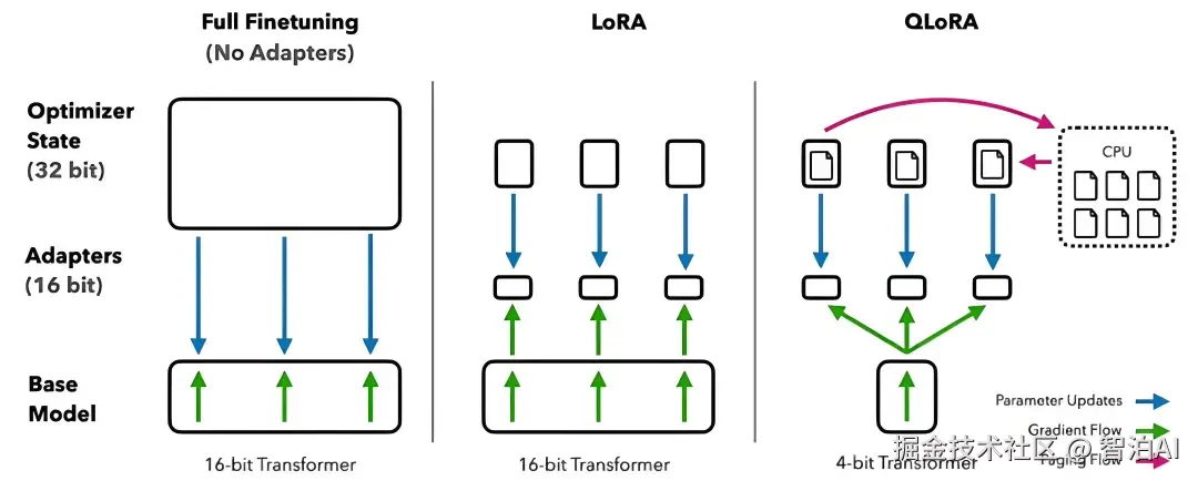 只训练底模的部分参数,通过修改部分参数调整模型整体能力,LoRA是其中的一种常用策略,(QLoRA类似于它的pro版,更轻量)