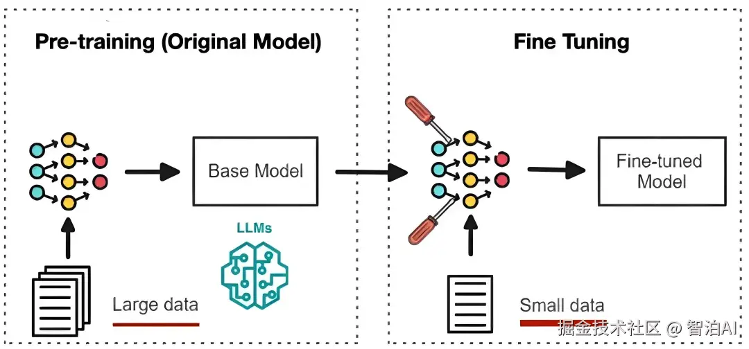 省钱省力:微调就像站在了"巨人(预训练模型)的肩膀上",避免了从零训练所需的巨大算力和数据成本。