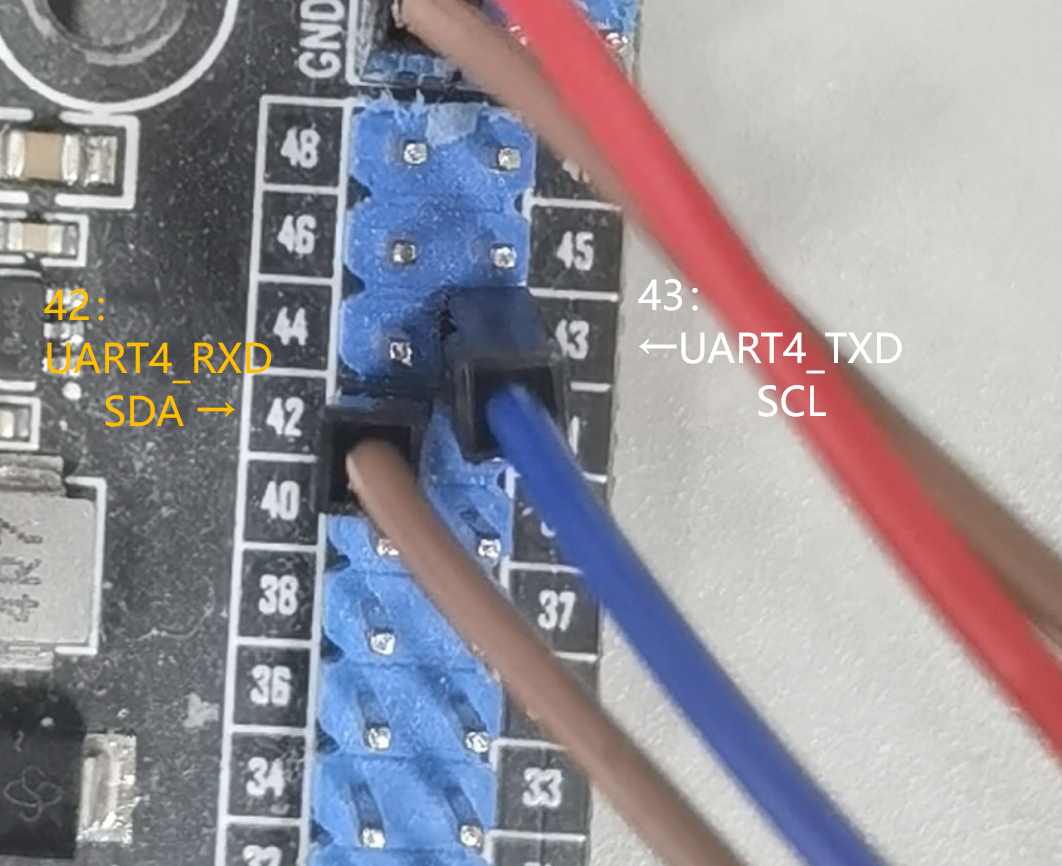 MPU6050只需要接四根线即可。我这里用的是imx6ull mini,MPU6050的SDA接42、SCL接43,再接上VCC和GND即可。AD0默认下拉,不用接。