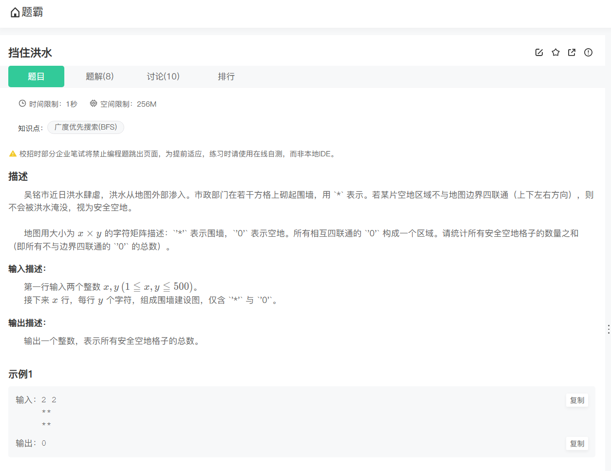 需要注意的点就是 如果矩阵长宽是n,m 我们应该要从当前矩阵的往外一层的(0,0)处开始BFS而不是(1,1),只要没有围墙,洪水就能进入矩阵。