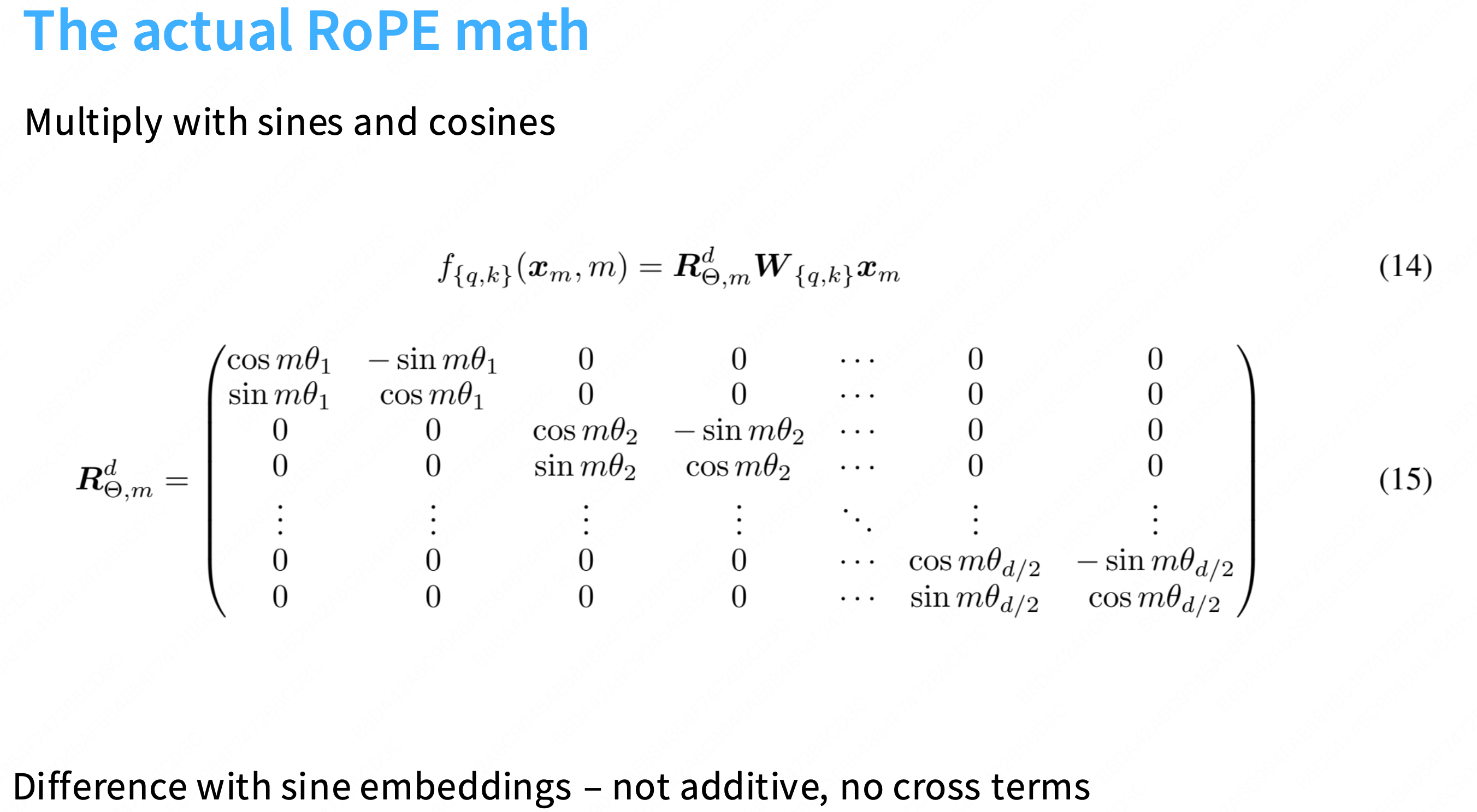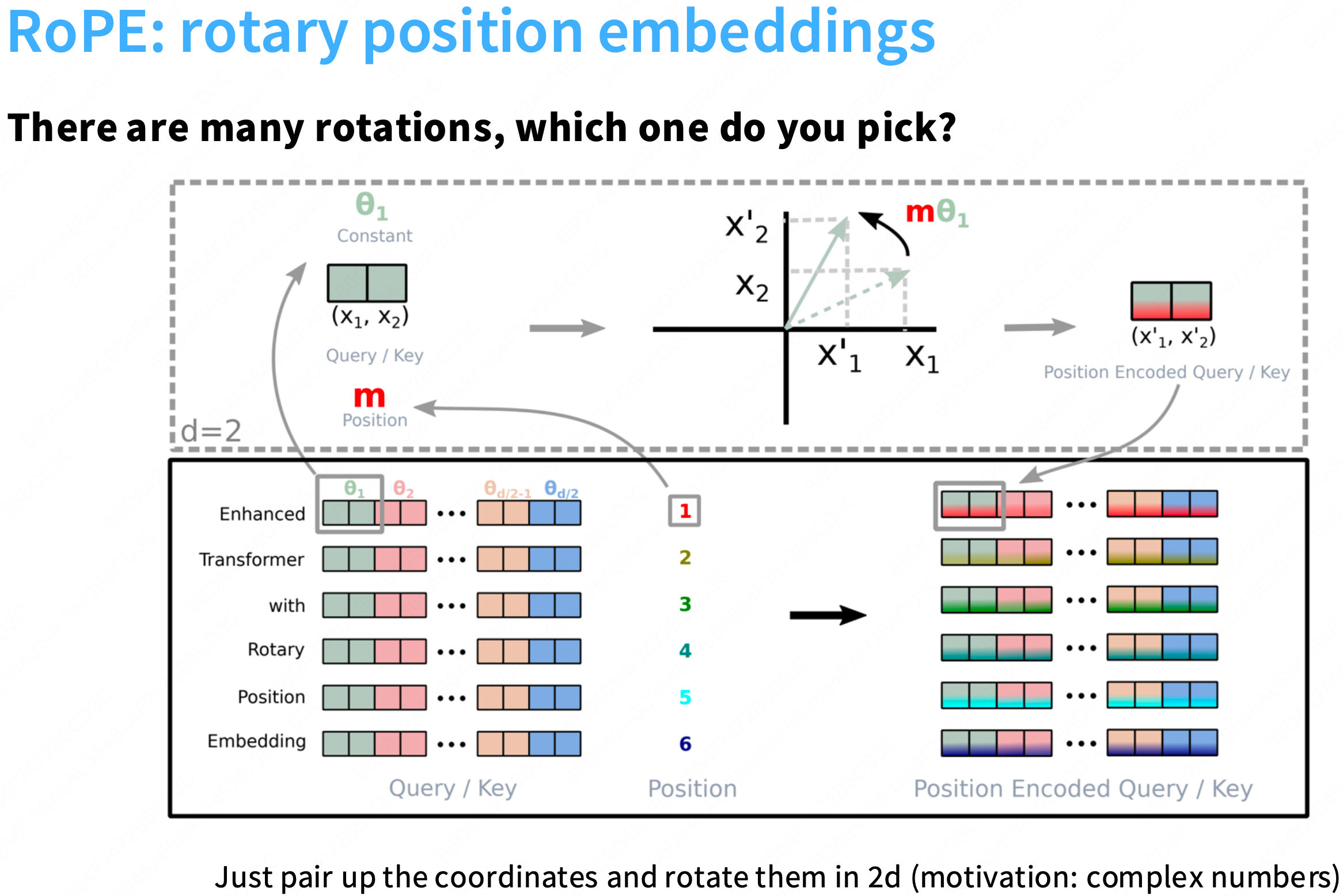 内积只会关注距离的差异, 通常这种旋转在2d是非常明显的,但在高纬中不太明显。rope的做法是将高纬度D切分成二维的块, 每两个维度将被某个theta旋转,因此会有一个旋转速度,我们将旋转这些维度对。