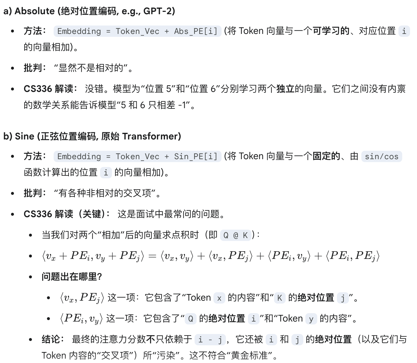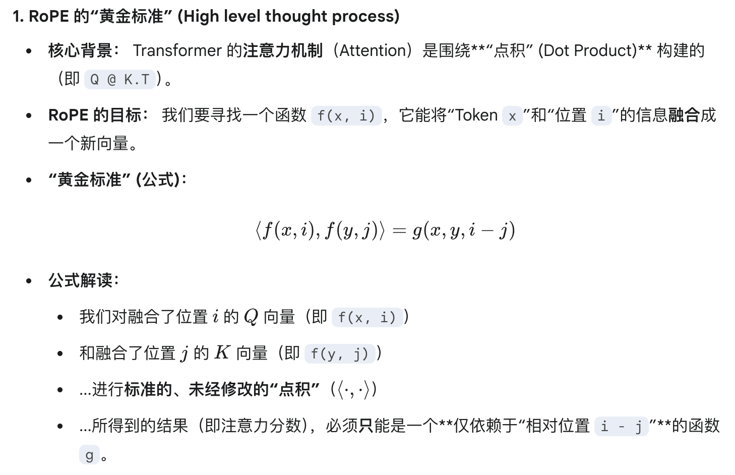 "RoPE 的设计哲学":它首先定义了一个"完美"的相对位置编码应该满足的 "黄金标准",然后论证了为什么之前的所有方法(Absolute, Sine, T5-style)都不满足这个标准。