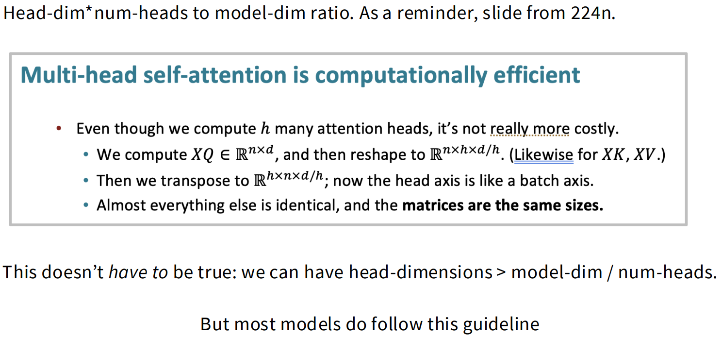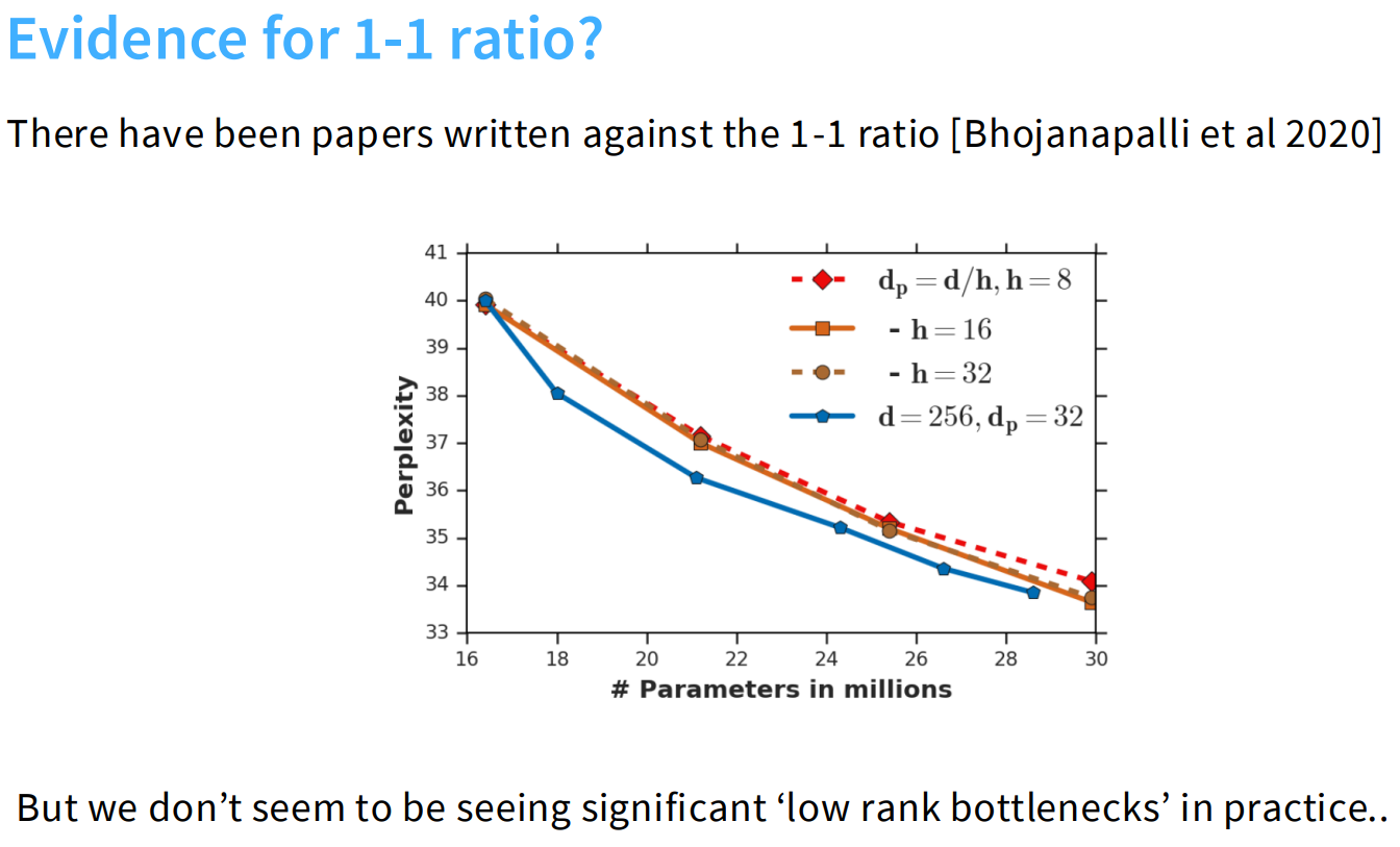 bhoj等人提出,如果在ratio=1的情况下,num-heads越多,head-dim越小,维度小对应矩阵的rank越小,每个头的注意力表达能力有限--->但实际并没有太大的影响。