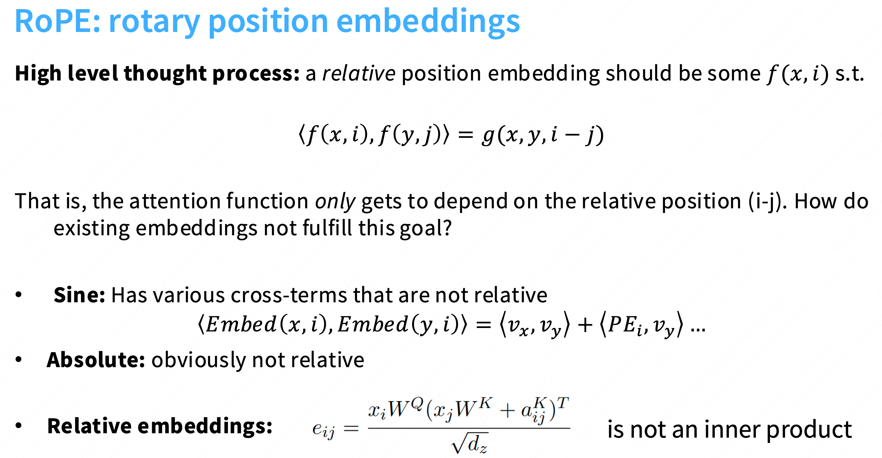 ROPE的高层思想:重要的是这些向量的相对位置。f(x,i)中的x是我要embedding的词,i是我的位置,你只关注词x和词y的距离。