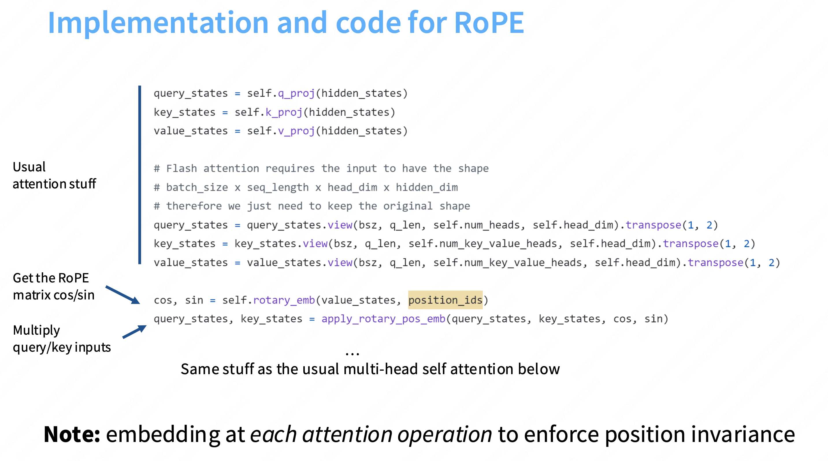 注意rope将在实际的注意力层进行操作, 而不是在底部添加位置编码。 只有当生成Query和Key的时候,需要这么计算拿到相对的位置信息。