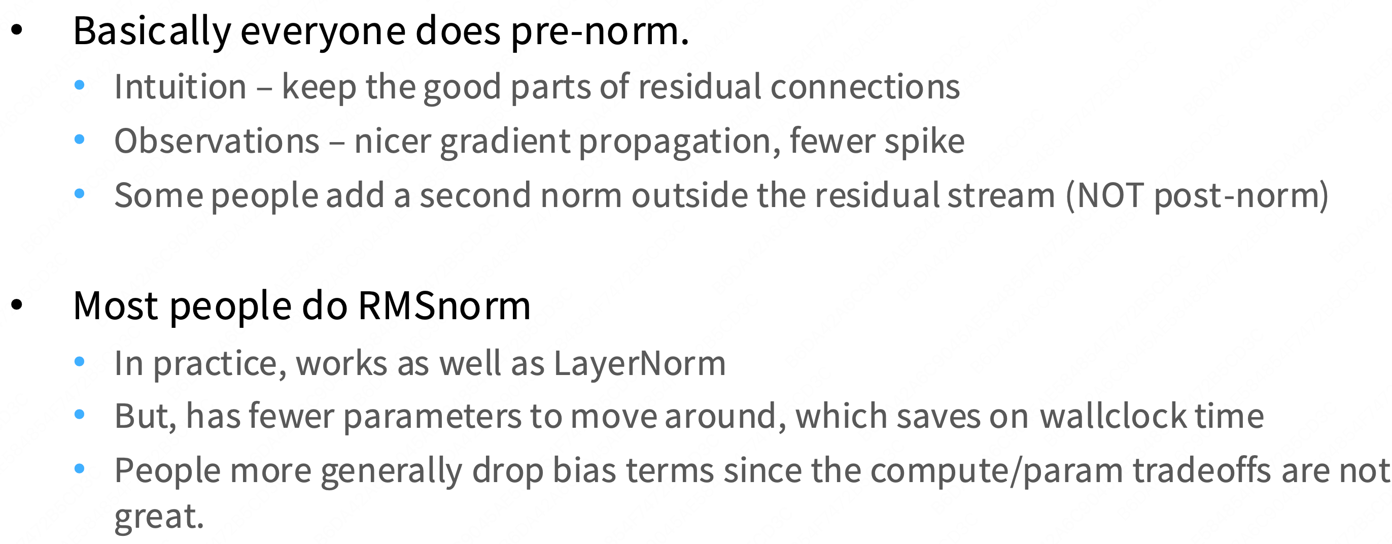 a: 一个直观的观点是,残差给你从网络顶部到底部的这种恒等链接,因此,如果你视图训练非常深的网络,这使得梯度传播非常容易,因此,有很多关于lstm和其他状态空间模型在反向传播梯度时困难的讨论,但这种恒等链接没有任何这样的问题,因此,在中间放置layernorm可能会干扰这种梯度行为。