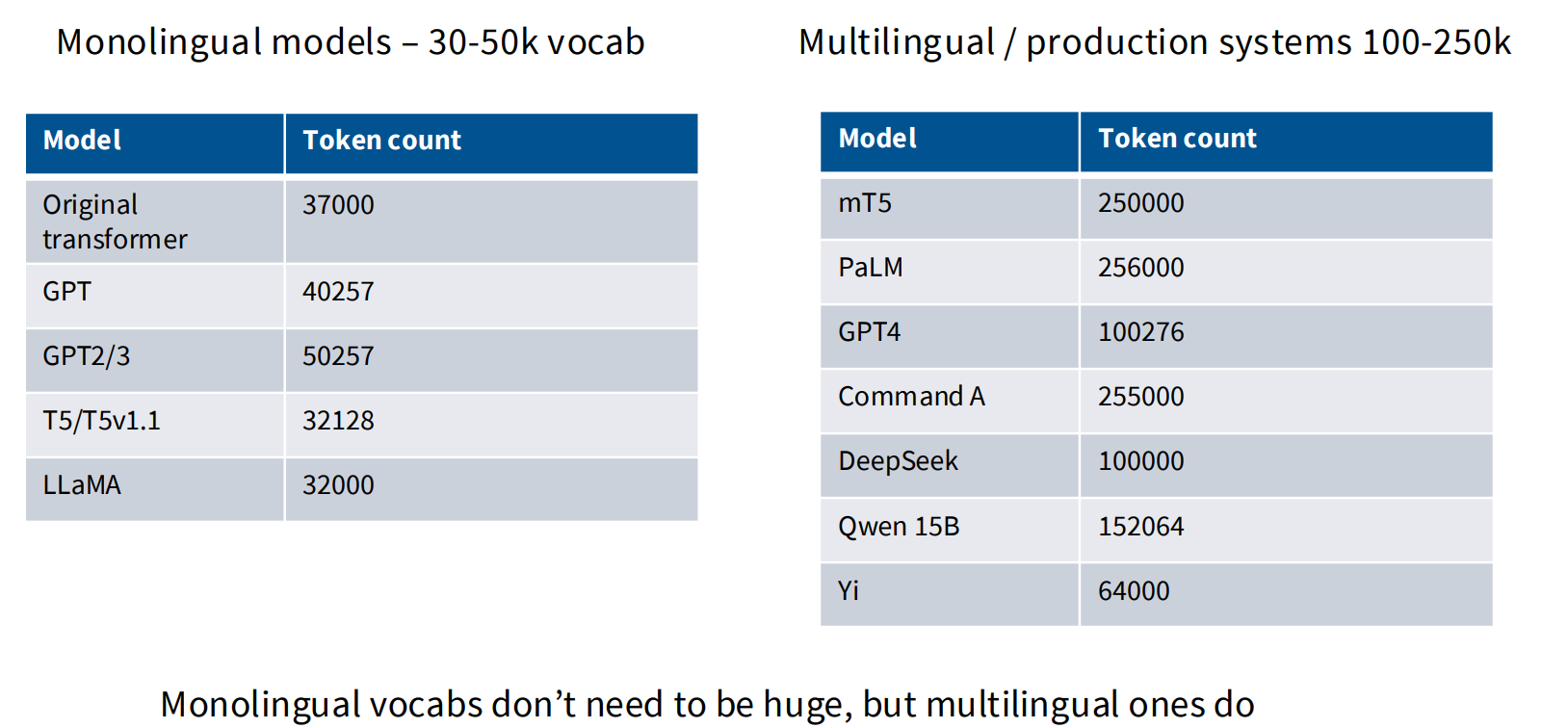 单语言大概在四五w的量级。多语言大模型的词表大概在十几万到二十几万这样。