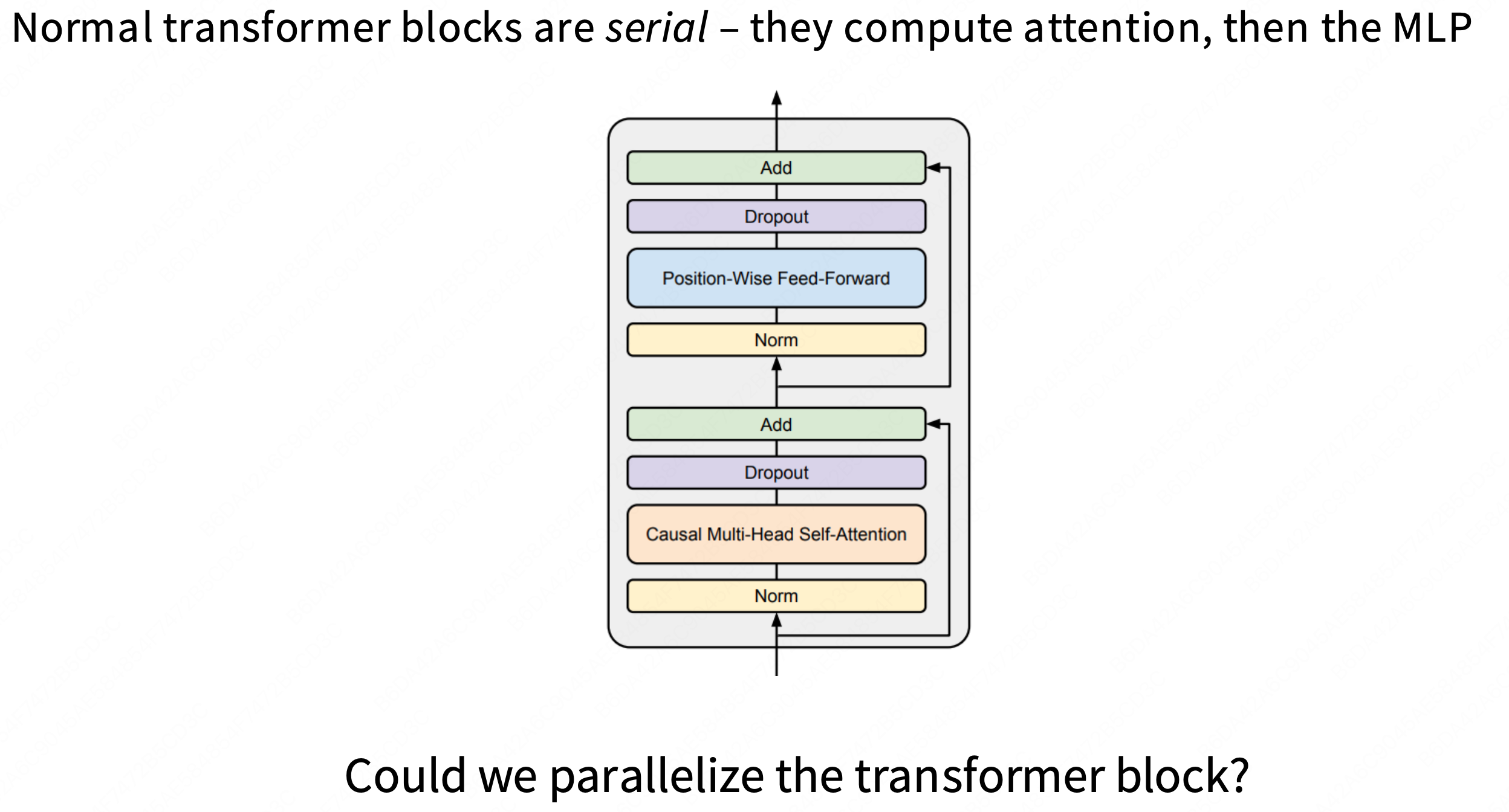 Attention(...)和MLP(...)可以并行计算。最后,将这两个块的输出与原始残差