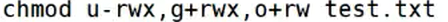 如上图的例子,为拥有者删去读写执行权限;为所属组加上读写执行权限;为其他人加上读写权限。不同身份之间使用逗号相连。这样我们就实现了一行命令修改多个身份用户的权限。
