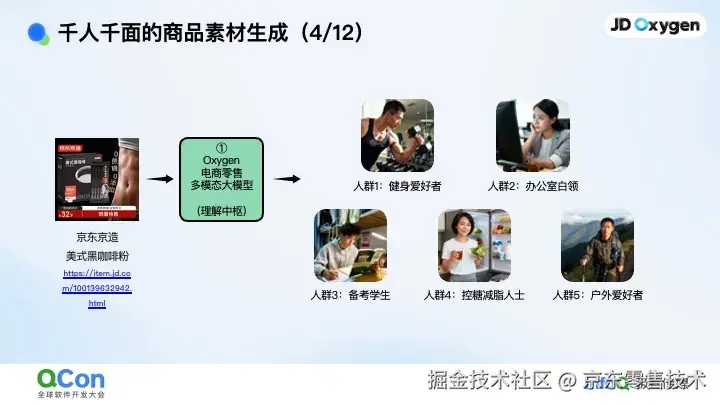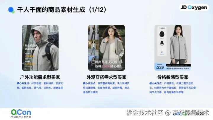 "千人千面"的搜索推荐,在这个时代大家肯定不陌生了,但是真正意义下"千人千面"的商品素材,其实作为消费者大家体感并不强烈,这也是整个电商行业和京东正在努力突破的技术产品方向之一。这个例子就非常典型,同样的一件冲锋衣,不同类型的买家关注点完全不一样。比如最左边的"户外功能需求型买家",Ta 所关注的是功能型指标,例如防风性、防水性、面料科技等等,中间的"颜控型买家",Ta 更多的则是关注服装本身的美观度、设计风格、以及与其他服装的搭配效果,所以商卡会呈现出较多 OOTD 相关的内容,也是一类非常典型的买家;最右边的买家同样典型,是"价格敏感型",会关注促销活动、赠品、价格是否为全网最低价,所以商卡的呈现一直在 highlight 优惠相关的信息。通过解释这三个 case,大家应该也清楚了什么叫"千人千面"的商品素材。接下来,我就和大家分享如何从技术上去实现这一套业务框架。