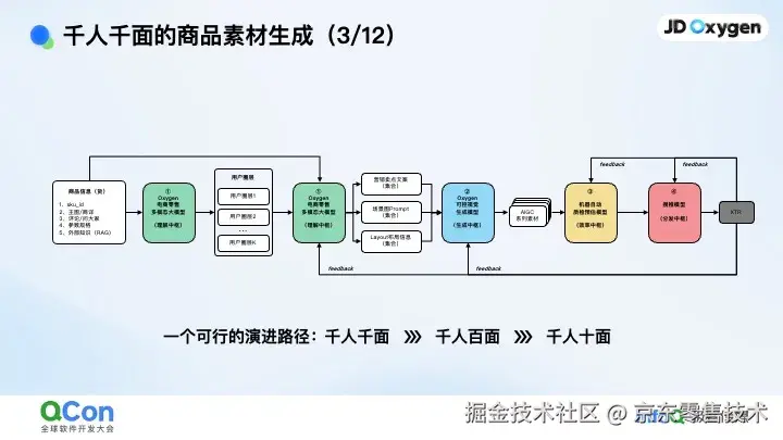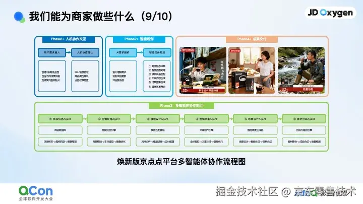 这张幻灯片展示了焕新版京点点平台的业务逻辑流转图,第一阶段是人机交互,这一阶段里用户将自己的需求描述给机器,机器来确认商品的相关信息是否完备,用户需求是否明确;第二阶段是非常经典的任务规划阶段,大模型在这个阶段要完成任务的拆解与规划,比如模型认为一个主图生产任务可以被分成 6 项工作,商品信息采集、智能抠图处理、模版风格匹配、文案内容生成、场景图像合成以及最终效果整合。所以,第三阶段的多智能体协作执行,在这个案例下就是有六个独立的智能体在串行执行。右上方是整个链路输出的实际素材效果。那我们整个焕新版京点点平台的技术框架就介绍到这里。