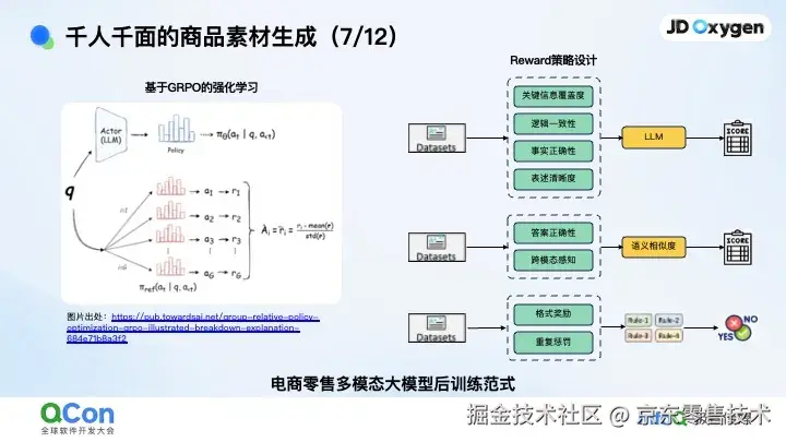 这页幻灯片我们给出了一个真实的用于电商零售多模态大模型后训练的 CoT 训练样本,输入是包括商品标题、类目、价格、商详、用户评价以及商品主图在内的商品多模态信息,CoT 部分则是一个四步思考的推理链条,大家感兴趣的可以详细阅读。