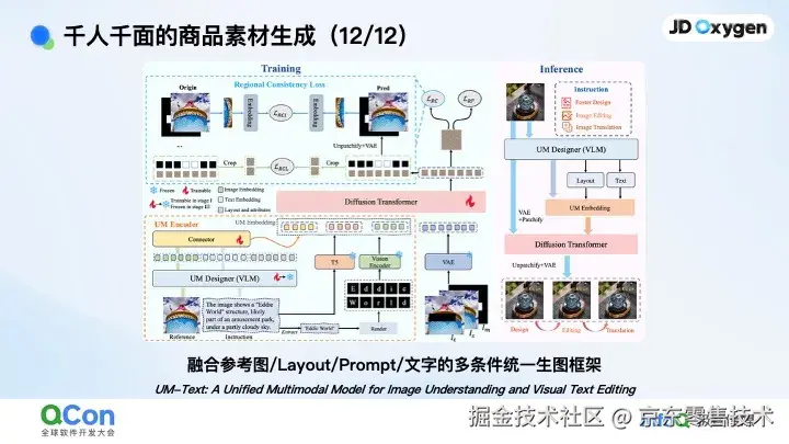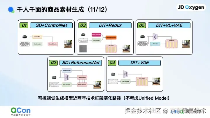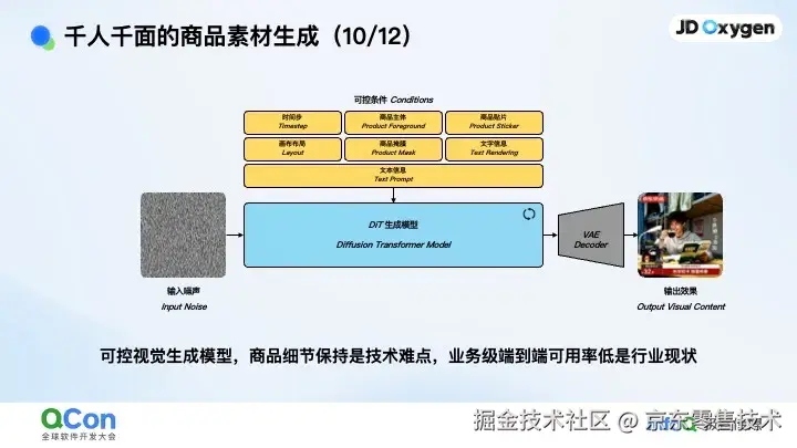 第二个我们要详细介绍的模型是可控视觉生成模型,这是一个基于多条件的扩散模型,上面黄色部分都是模型的可控条件,这里除了扩散模型所必须的 Timestep 和文本 Prompt 外,商品主体、文字、布局 Layout、贴片都是可以作为可控条件输入的,不过之所以是大家现在看到的框架,本质原因还是生成模型的文本指令跟随能力较弱,未来我们会看到不同类型的可控条件都可以统一到一个自然语言描述的文本空间,同时理解模型也会和生成模型实现架构上的紧耦合。但是,站在业务的角度来看,电商领域的可控生成是所有领域中要求最高的,也是最严肃的场景,任何商品信息的改变都会引发非常严重的业务后果,所以到目前为止业务级端到端的素材生成可用率也是比较低的,这是行业现状。