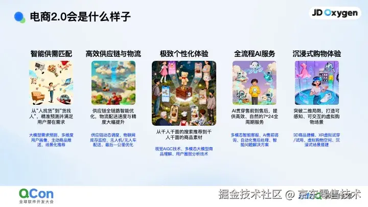 首先是更加智能的供需匹配,从过去的"人找货"进化到"货找人",借助大模型的世界知识结合用户行为与多维度画像,配合场景化的推荐,实现精准的用户需求匹配;其次是高效的供应链与物流体系,这里会有供应链的动态调度,会有无人车 / 无人机去实现最后一公里的效率优化;接着是全流程的 AI 服务,这个会贯穿售前到售后,借助多模态大模型达到 7*24 小时的全周期服务;当然体验上电商 2.0 时代也会突破原有的二维局限,打造可感知、可交互的沉浸式虚拟购物体验。最后,也是我今天要重点和大家分享的是,极致的个性化体验,即从"千人千面"的搜索推荐到"千人千面"的商品素材,这里涉及到多模态理解模型与 AIGC 视觉生成模型,接下来我会详细的给大家分享。