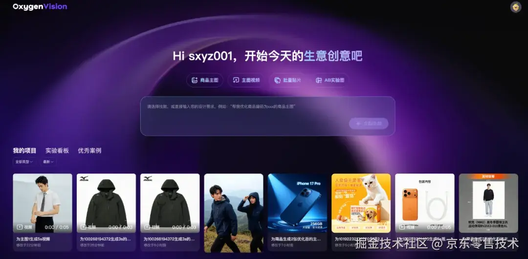 具体地,我们带来了 4 个重大升级点。第一,对话式的人机交互,这里商家用户可以直接将自己的作图需求用自然语言的方式描述出来,包括场景、卖点、生图风格、生图数量等需求,当然如果没有明确的思路也可以把一切都交给大模型来让它发挥处理;第二,大模型规划与执行,大模型会根据用户的需求来自行拆解与规划任务,并调用相应的智能体和工具来逐步操作;第三,我们尽量从算法实现的角度来保证商品的一致性,同时也提供了更加多样化的呈现形式;第四,焕新版京点点平台内生成的素材可以无缝接入京东素材 AB 实验平台,帮助商家进行素材的实验验证。接下来,我给大家播放一个视频演示。