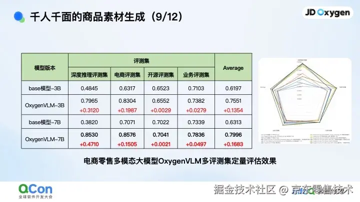 这是我们提出的 OxygenVLM 的定量评测,评测集包括用于通用任务的开源评测集,也包括零售行业的业务评测集、电商评测集以及电商深度推理评测集,我们的目标是希望 OxygenVLM 相比基础通用 VLM 在开源评测集不损失性能,同时在零售行业评测集有较大优势。