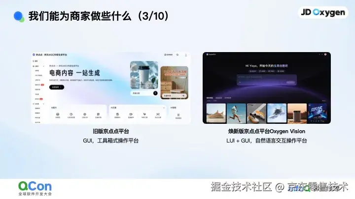 那么今天我们借 QCon 这个场合,也向大家正式发布我们焕新版的京点点平台,它也是整个 Oxygen 大模型家族中的一员,叫做 OxygenVision,这次升级我们从原来的工具箱式的 Graphical UI 升级到最新的 Linguistic UI + Graphical UI 的方式,实现了人与机器完全基于自然语言的交互形式。