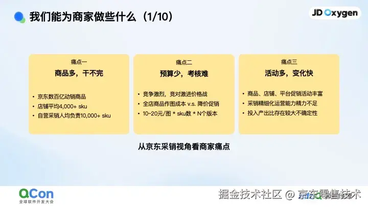 首先,我们从京东采销的视角来看看商家有着什么样的痛点。第一,商品多,活干不完,大家知道在京东我们有数百亿的动销商品,店铺平均 sku 达 4000 以上,以自营采销为例,平均每人要处理上万的 sku。第二,预算少,考核难,大家知道各个电商平台都在激进的进行价格战,在这个大背景下,全店铺商品的素材制作成本也是一笔不容忽视的成本开销。第三,活动多,变化快,商品、店铺、平台促销活动非常丰富,而采销精细化运营的能力其实是参差不齐的,且精力不足,因此在每个活动上的投入产出比具有非常大的不确定性。