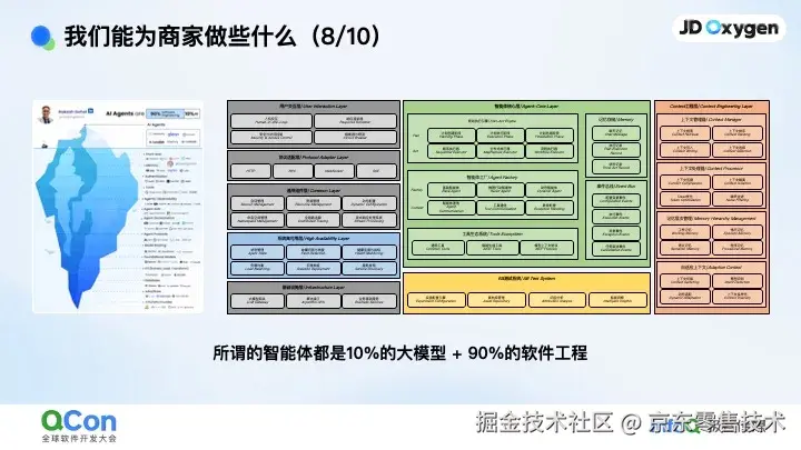 看完视频大家肯定都想了解下背后的技术实现,我这里用两页幻灯片给大家做一下分享。首先,毫无疑问,这是一个复杂的多智能体协同系统,提到智能体,现在应该还有一部分同学会觉得智能体就是一个 SOTA 的大模型加上一段 System Prompt 就能实现,其实真实的工业级应用智能体研发更像是冰山模型。左边这张图是我想要和大家分享的,一个完整的智能体系统只有 10% 的大模型,剩下水面下的 90% 都是软件工程。右边这张图是焕新版京点点平台的智能体技术模块框架图,这 90% 的工作量包含哪些呢,包含系统的高可用层(这里涉及到复杂的智能体状态管理、负载均衡、故障恢复以及健康监测等)、 包含记忆存储、包含事件总线、包含上下文的处理器、管理器等等。这张图文字太小,当然不是为了让大家一定都能看清楚的,主要是为了能让大家感受到一个智能体系统提示词之外的工作量在哪里。
