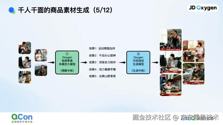 有了这些目标人群,接下来再次通过电商零售多模态大模型去生成不同人群所对应的商品素材场景,然后通过可控视觉生成模型去完成完整的商品素材生成。最后大家看到的这些素材就是可以直接参与个性化投放的商品物料了。同时,大家可以看到,在这页幻灯片里,或者说在整个技术链条中,有两个基础模型非常关键,一个是圈 1 的电商零售多模态大模型,也就是我们的理解中枢,一个是圈 2 的可控视觉生成模型,即我们的生成中枢,接下来我将为大家介绍这两个模型的技术实现框架。