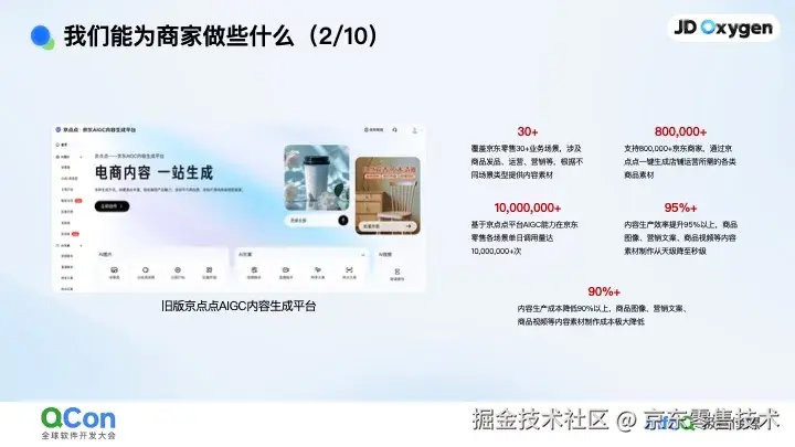 针对这些痛点问题,过去一段时间我们通过京点点 AIGC 内容生成平台服务了京东零售超过 30 个业务场景,支持了 80 万以上的京东商家,每天京点点平台的 AIGC 能力调用量达 1000 万以上,内容生产效率提升了 95% 以上,同时也带来了生产成本上的大幅优化。