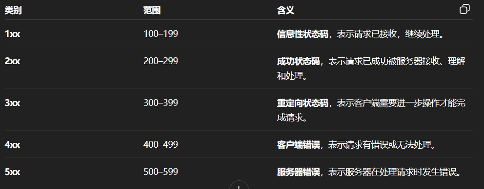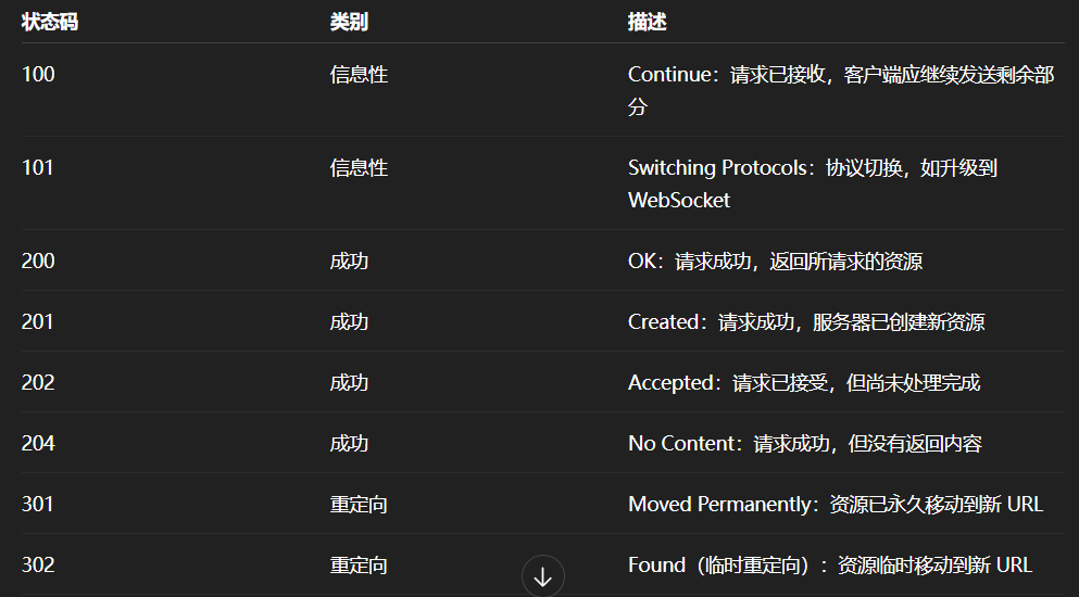 就是对于返回的的状态码进行的一个描述信息,比如 OK,错误之类的。这个对于我们后端工程师来说不是很看重,可以随意书写🙃。下面是一些状态码描述,想要了解自己去查看就可以了。