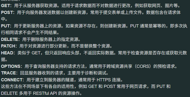 这一部分内容也就是 HTTP 报文的第一个位置的内容,下面是所有的方法,而比较常见的就只有get,post。我的下文重点进行描述,也仅仅只是基于这两种方法来进行详细的结束。