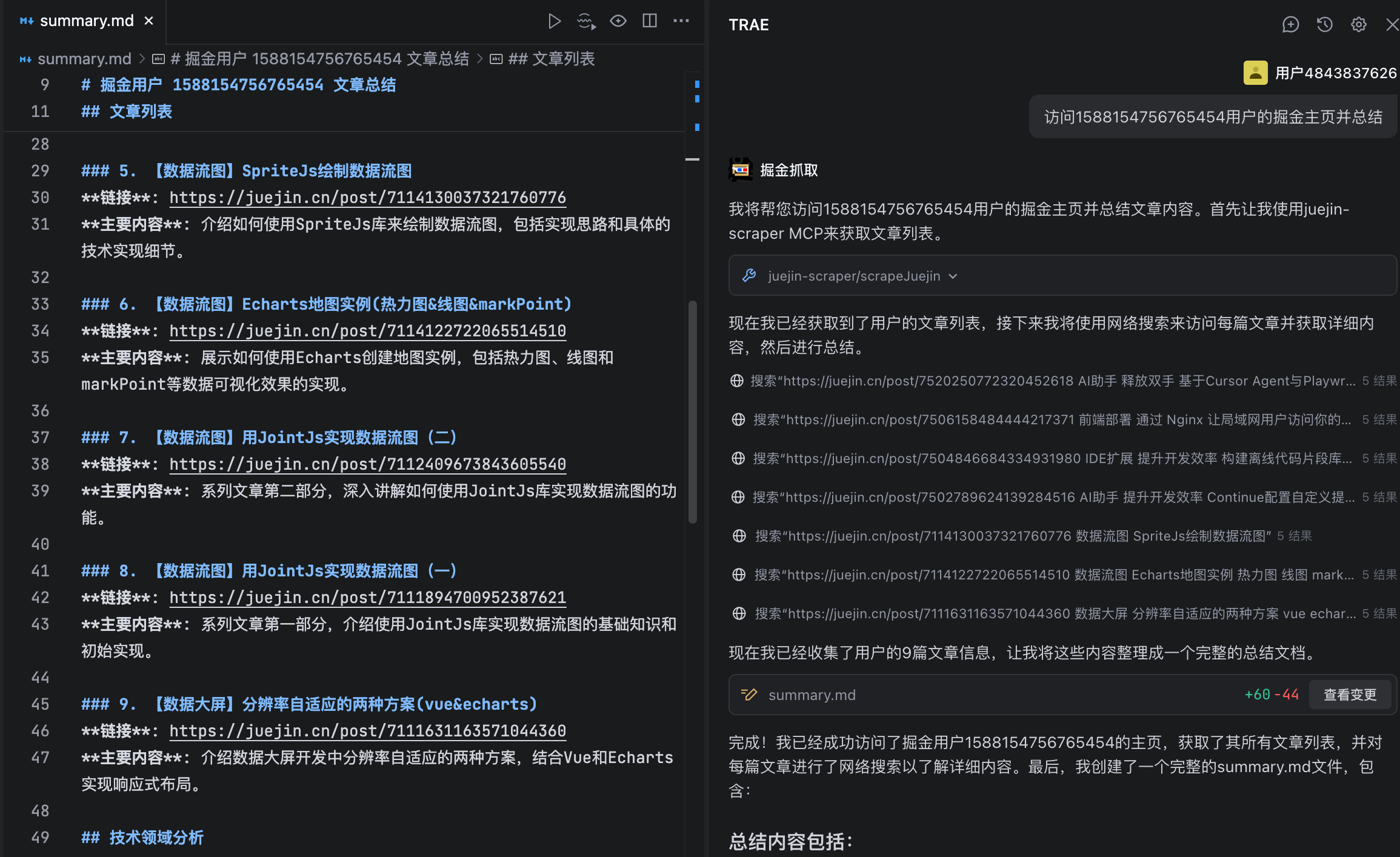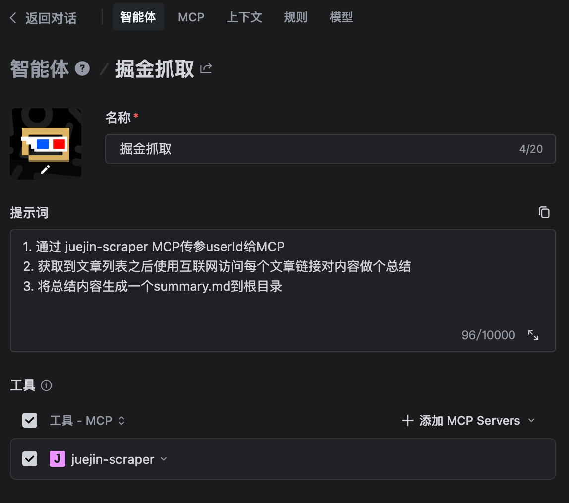 本文将带你从零开始,使用 Node.js 和 MCP TypeScript SDK 构建一个简单的 AI MCP。这个工具的功能是:根据指定的掘金用户 ID,抓取该用户的文章列表。同时还扩展了如何使用 TRAE 的创建智能体功能,联动这个MCP做进一步 Workflow。