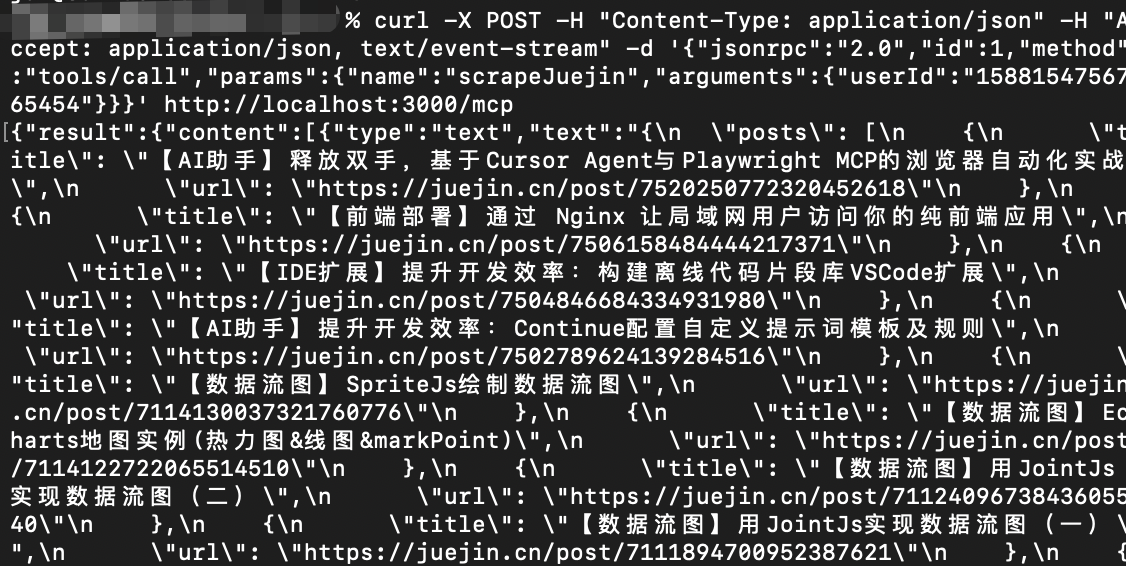 curl -X POST -H "Content-Type: application/json" -H "Accept: application/json, text/event-stream" -d '{"jsonrpc":"2.0","id":1,"method":"tools/call","params":{"name":"scrapeJuejin","arguments":{"userId":"1588154756765454"}}}' http://localhost:3000/mcp