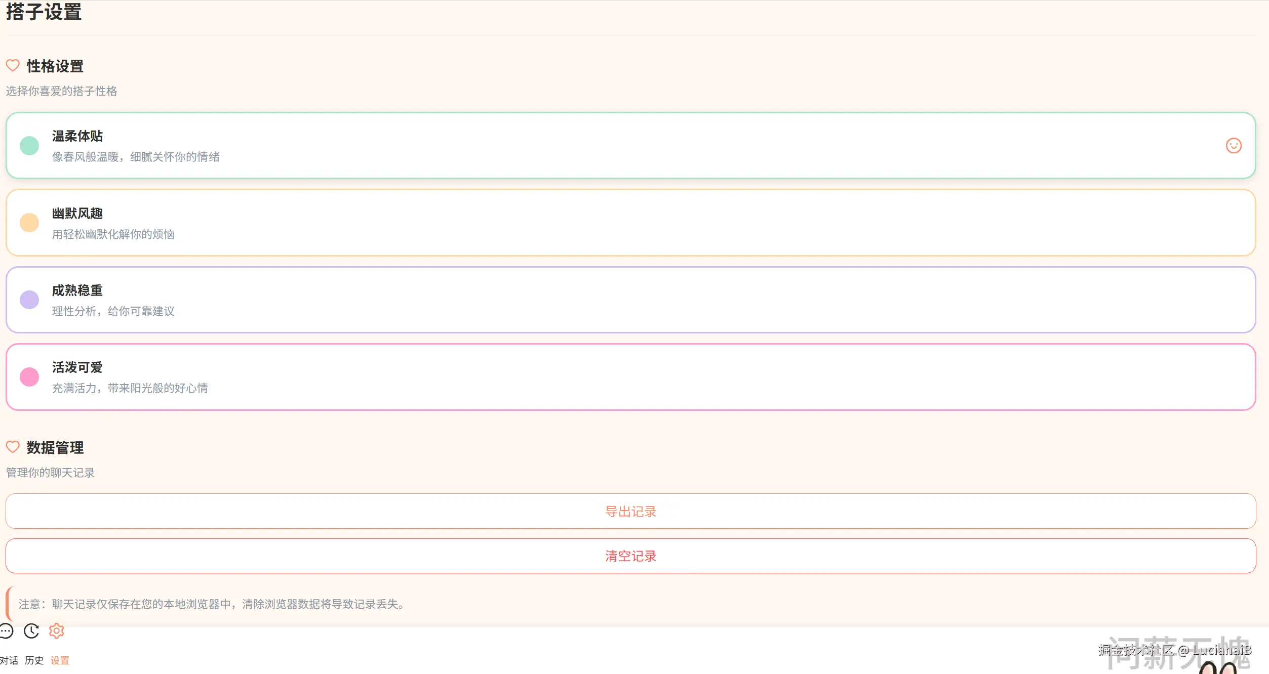 后台可自定义性格等 Agent的另一大亮点在于其高度的可定制性。在后台管理系统中,用户可以根据自己的喜好,自定义Agent的性格、兴趣爱好、说话风格等。例如,可以将Agent设置为"活泼开朗型"、"沉稳理性型"或"温柔治愈型"等。这种自定义功能使得Agent能够更好地适应不同用户的个性和需求,真正成为每个人的"专属搭子"。