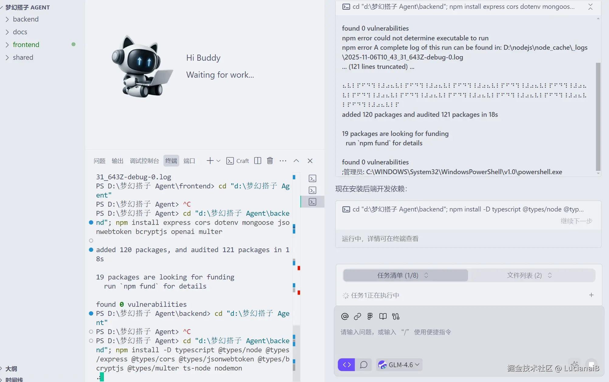 本次实践成功地将CodeBuddy的快速开发能力与GLM-4.6的强大语言模型相结合,实现了"梦幻搭子Agent"的原型开发。整个过程充分体现了AI作为开发助手的巨大潜力:从模糊的需求到可运行的代码,AI承担了大部分繁重的编码和调试工作,开发者只需专注于核心逻辑和用户体验的设计。 "用AI对抗AI,用技术反哺成长"的理念在此次实践中得到了很好的体现。我们利用强大的AI工具来构建更能服务于人的AI应用,这本身就是一种技术的正向循环。 正如文章开头所言,"AI的出现,让我们只需说明想法,让它去干活即可------就像一个产品经理,手下有人干活。" CodeBuddy + GLM-4.6 的组合,正是这一理念的完美诠释。它们为开发者提供了一个强大的"梦工厂",让创意能够更快速、更高效地转化为现实。未来,随着AI技术的不断进步和生态的日益完善,我们有理由相信,像"梦幻搭子Agent"这样的应用将变得更加智能、更加普及,成为我们生活中不可或缺的一部分。