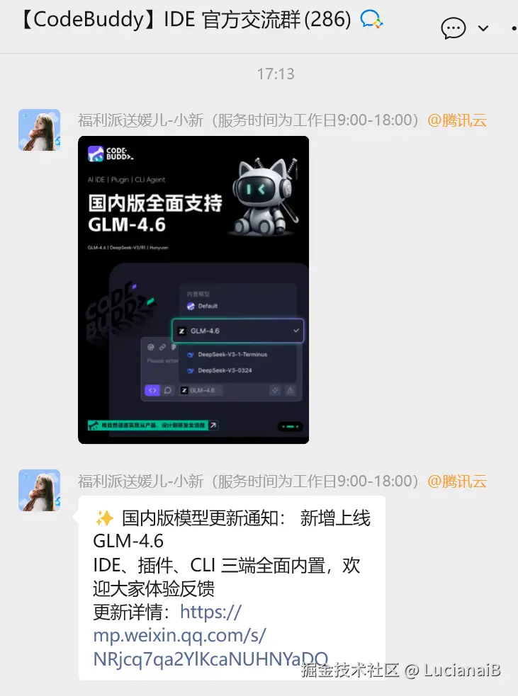 之前写过 CodeBuddy 和 GLM-4.6 的不少文章,感兴趣的可以了解一下。GLM-4.6的编程能力很强,但是由于 CodeBuddy国内模型不支持GLM-4.6,一直没办法使用,但是今天突然在群里看到:✨ 国内版模型更新通知: 新增上线 GLM-4.6 ,那必须第一时间来试试。